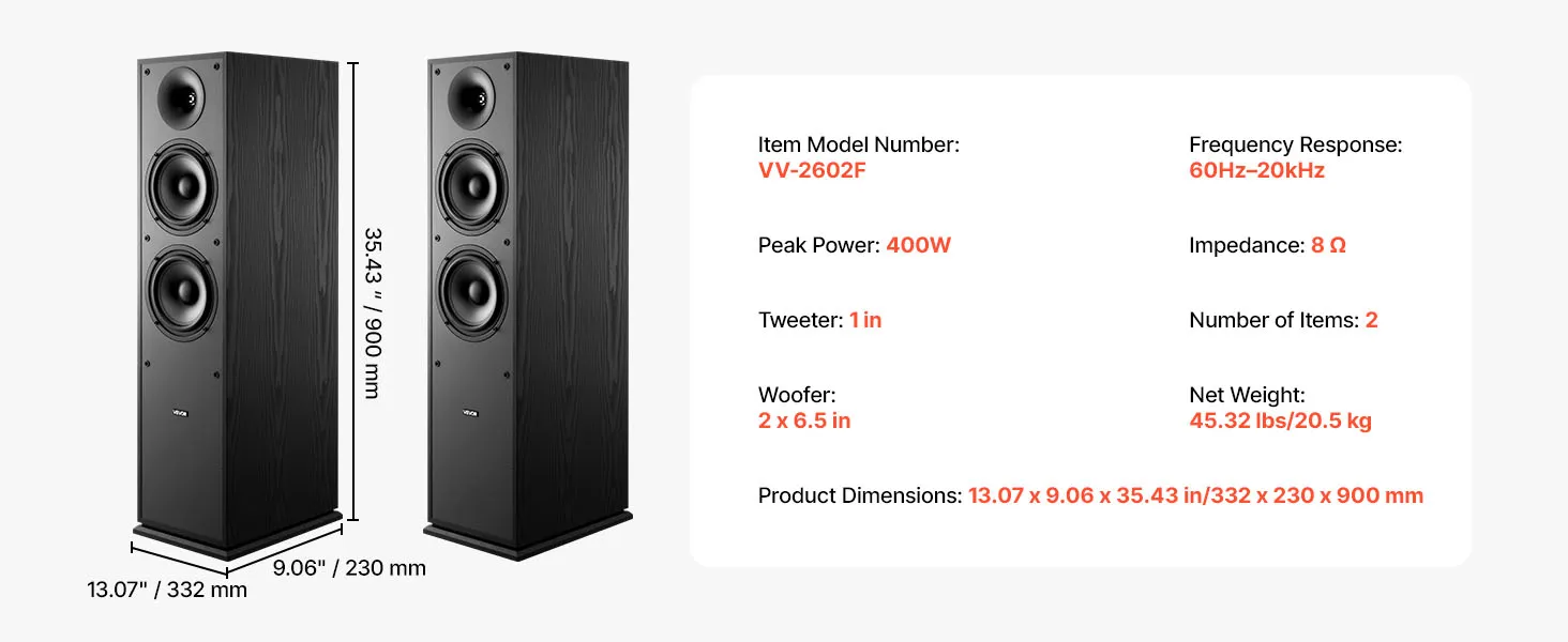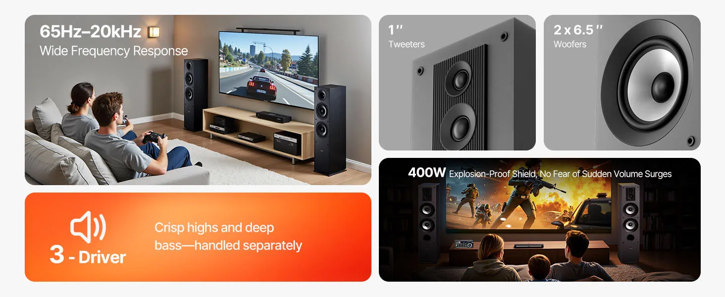 Pozdvihnite svoj domáci zvuk na vyššiu úroveň! Sú vybavené 1-palcovým výškovým reproduktorom a dvoma 6,5-palcovými basovými reproduktormi, ktoré poskytujú jasné výšky, bohaté stredy a hlboké basy. Skriňa z MDF minimalizuje rezonanciu pre čistý a presný zvuk a vďaka odnímateľnej mriežke je bežné čistenie hračkou.