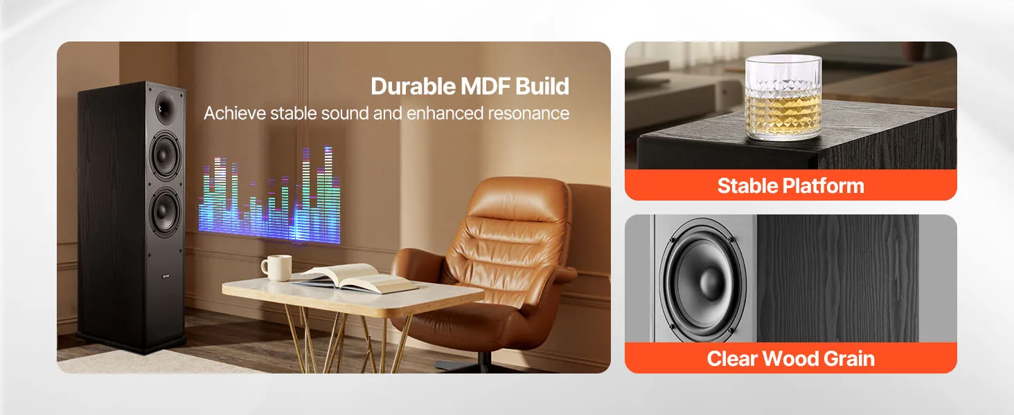 Skriňa MDF nášho stojaceho vežového reproduktora znižuje nežiaduce rezonancie a vibrácie a poskytuje čistejší a presnejší zvukový výkon.
