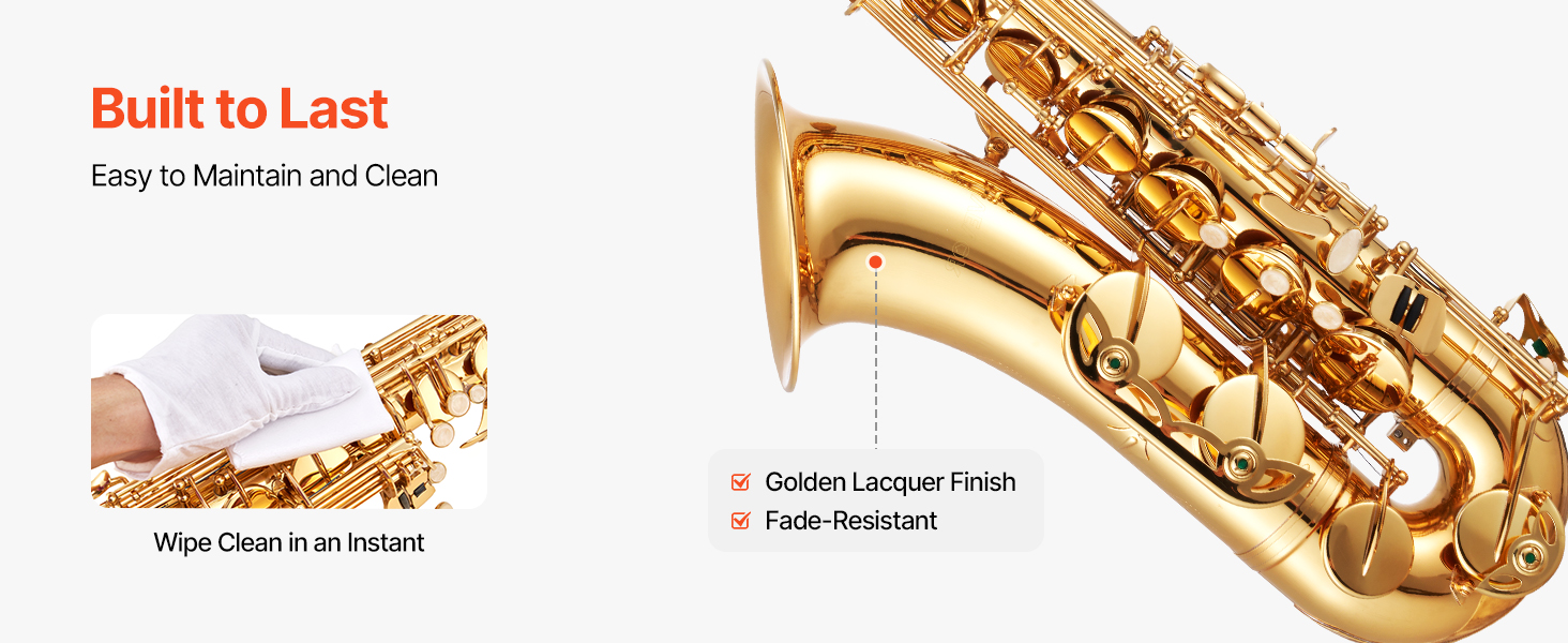 Vďaka elektroforetickému povlaku a zlatej povrchovej úprave sa táto saxofónová súprava pre začiatočníkov nielen ľahko udržiava a čistí, ale je aj konštruovaná tak, aby dlho vydržala.