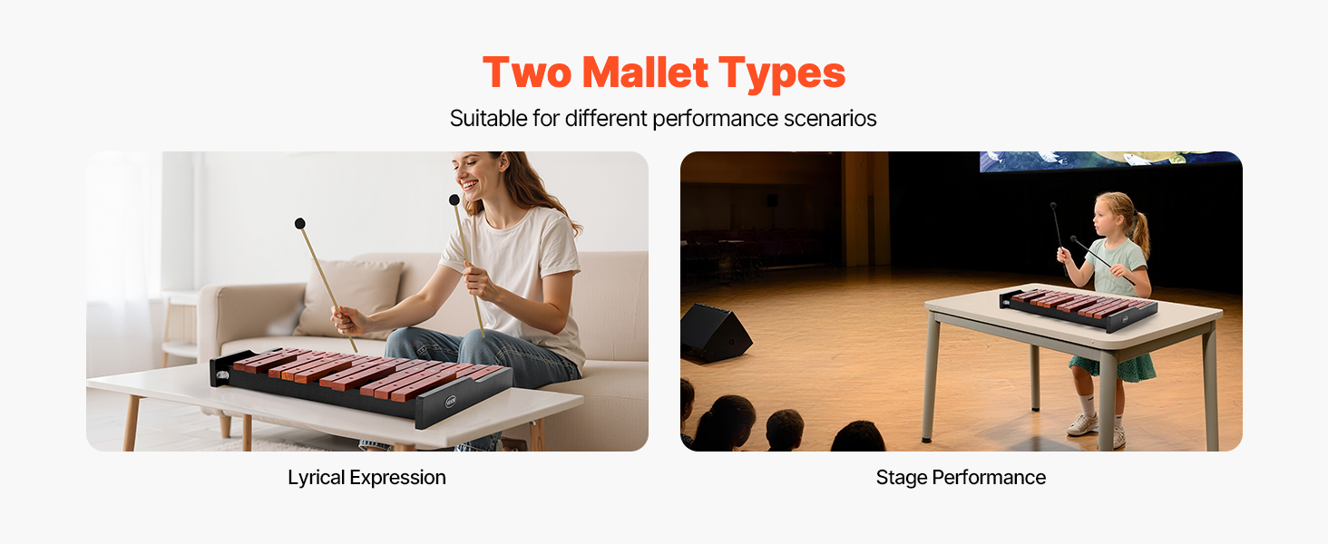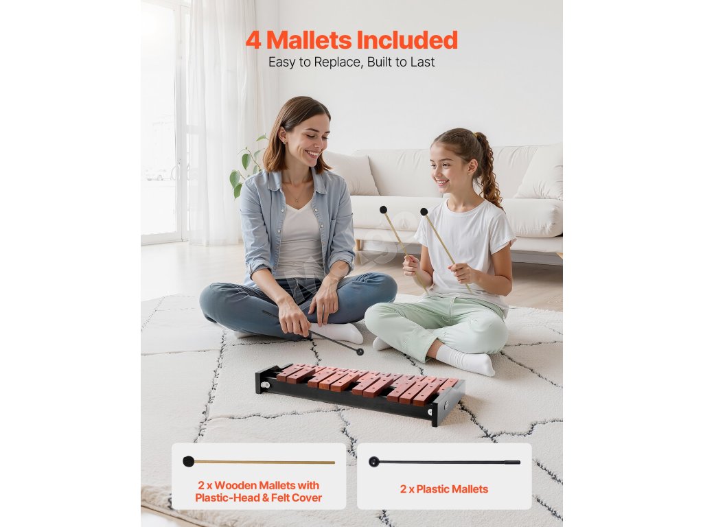Súčasťou sú 2 plastové a 2 drevené paličky, tento xylofónový perkusný nástroj sa prispôsobí vášmu štýlu. Plastové paličky prinášajú jasné tóny, zatiaľ čo drevené paličky vytvárajú teplejšie, mäkšie tóny - skvelé na všetko od expresívneho cvičenia až po vystúpenia pripravené na javisko.