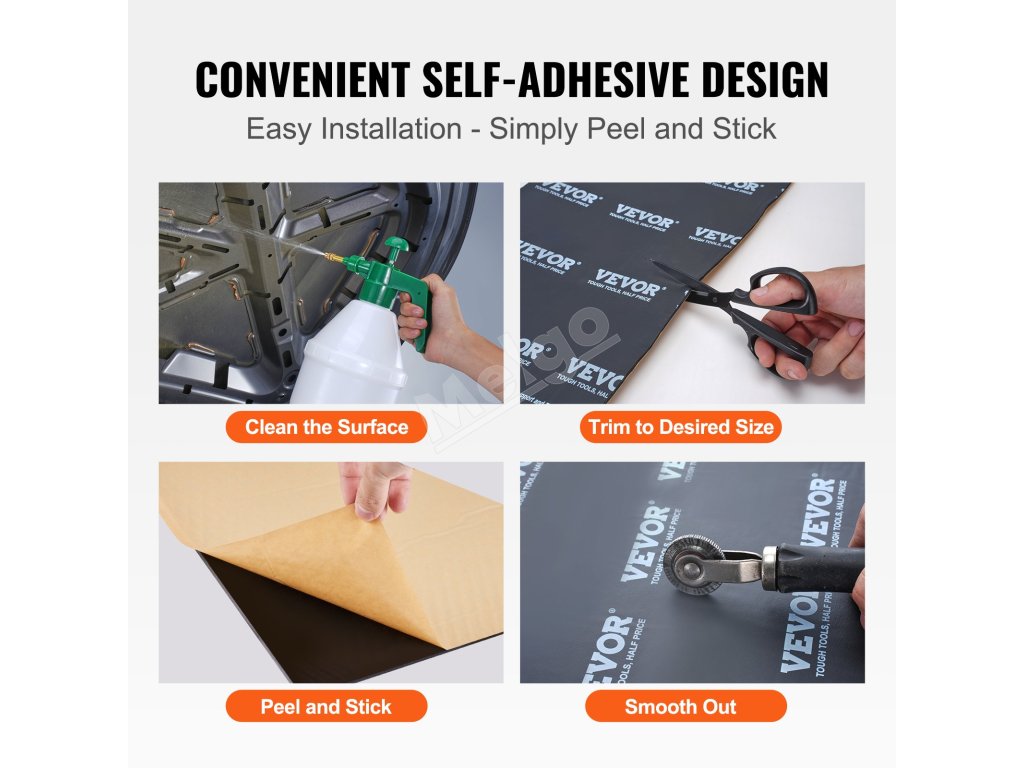 Naše súpravy zvukovoizolačných rohoží sú vybavené vysokopevnostným lepidlom, ktoré nevyžaduje dodatočnú ručnú aplikáciu. Stačí odlepiť podkladový papier a bude pevne držať v podmienkach vysokých aj nízkych teplôt.