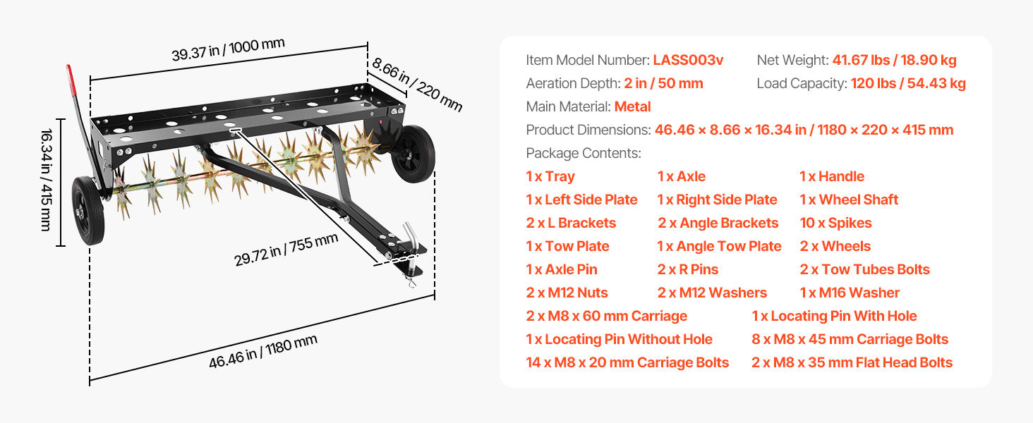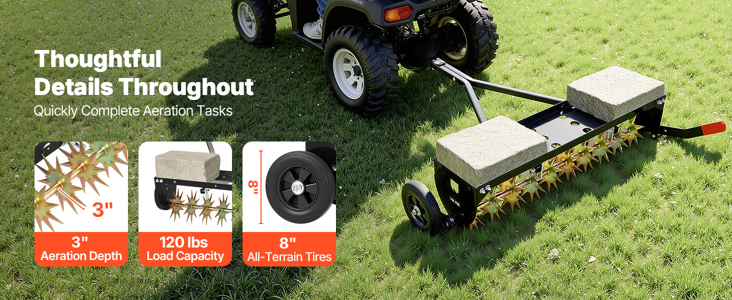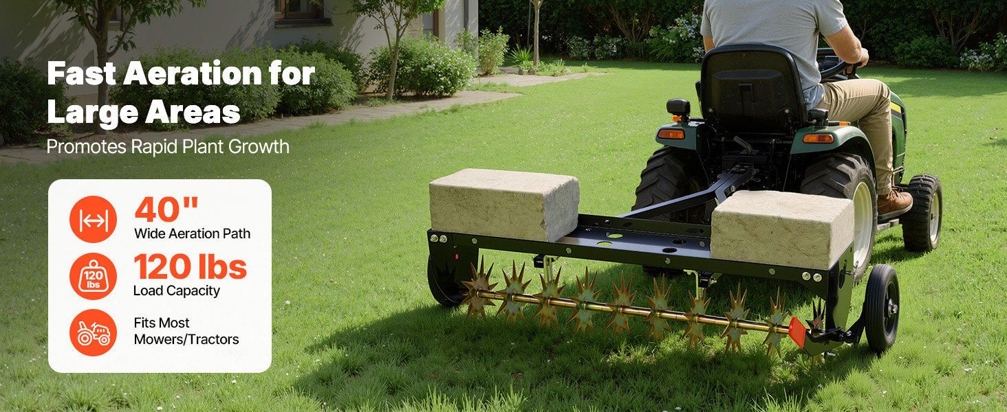 Tento aerátor ťahaný za traktorom pokrýva mimoriadne širokú 40-palcovú šírku provzdušňovania v jednom prechode a unesie až 120 libier dodatočnej hmotnosti, čo umožňuje hrotom pevne a rovnomerne preniknúť do pôdy. Kompatibilný s väčšinou záhradných traktorov a jazdeckých kosačiek – bez ohýbania, bez nutnosti ťažkého tlačenia.