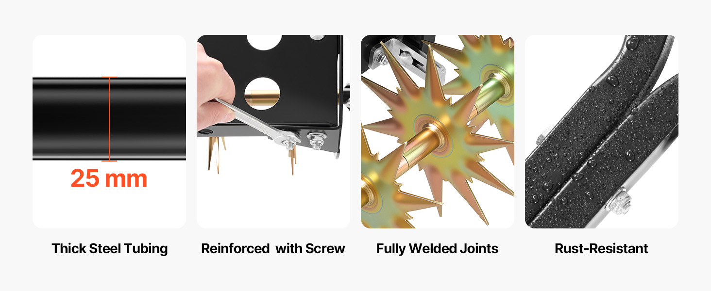 Tento ťahaný aerátor je navrhnutý s dôrazom na pevnosť a odolnosť. Zosilnené oceľové rúrky, úplne zvárané spoje a vyztužené kovové časti zabraňujú ohýbaniu alebo uvoľňovaniu počas používania. Povlak odolný proti korózii chráni rám pred bahnom, dažďom a pôsobením hnojív.
