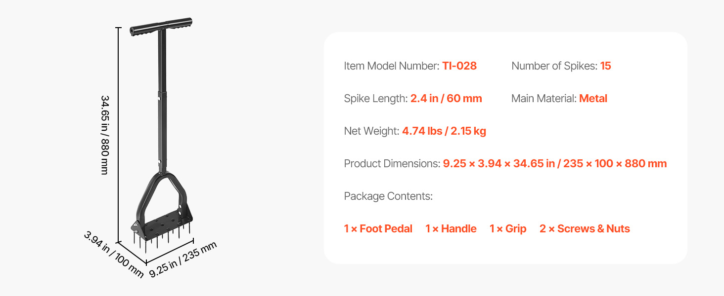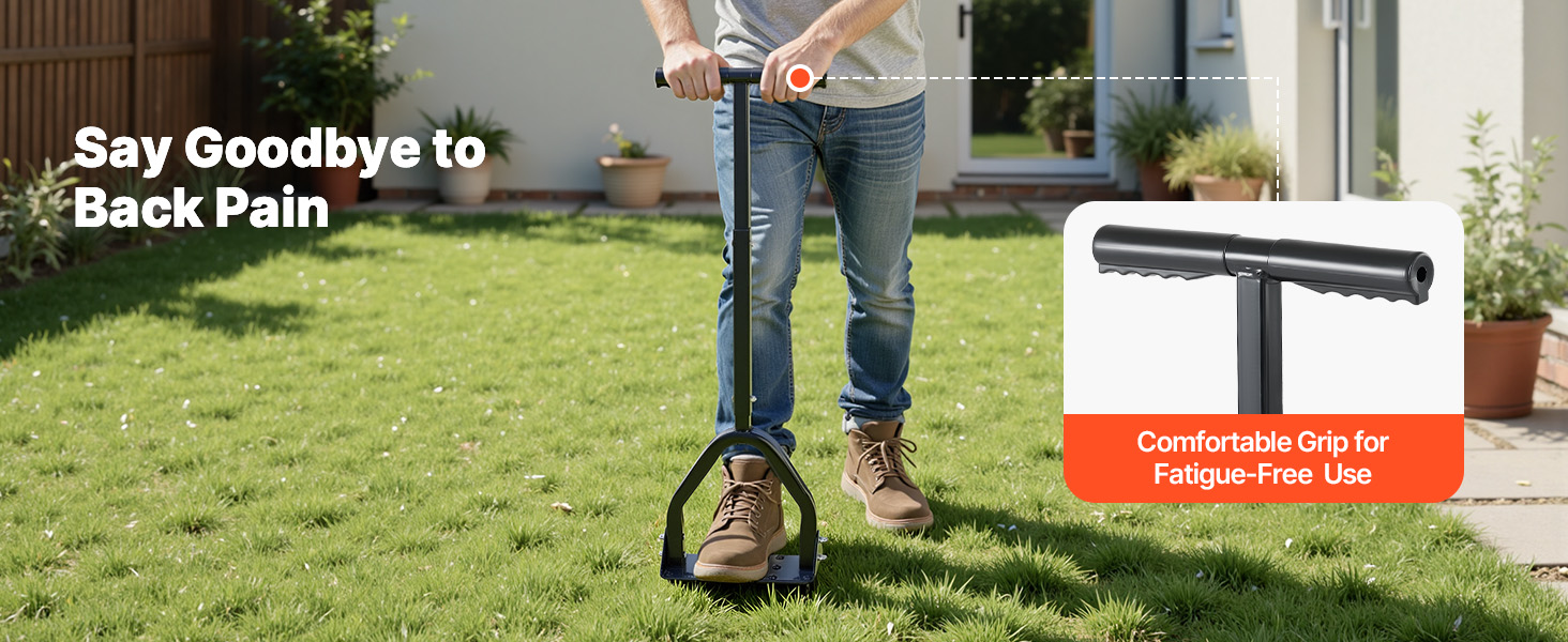 Vďaka ideálnej výške 34,6 palca môžete aerátor na trávnik pohodlne obsluhovať bez ohýbania sa, čo pomáha znižovať únavu chrbta a bedier. Rukoväť má zväčšený priemer s protišmykovým úchopom pre bezpečné a pohodlné držanie a ľahšiu obsluhu.