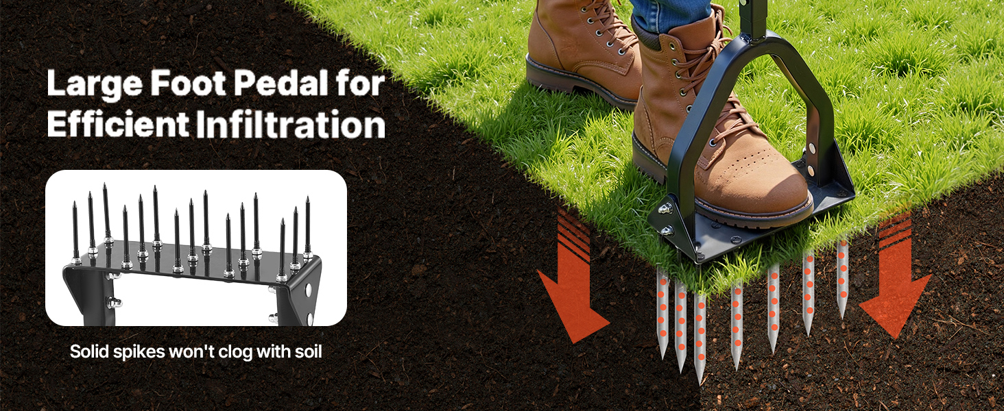 Zväčšená podložka pod nohou poskytuje väčšiu stabilitu a vyžaduje menej námahy pri každom kroku, čím uľahčuje prenikanie. Konštrukcia hrotov z masívnej ocele odoláva usadzovaniu blata, takže nie je potrebné počas používania zastavovať a čistiť, čo výrazne zlepšuje účinnosť prevzdušňovania.