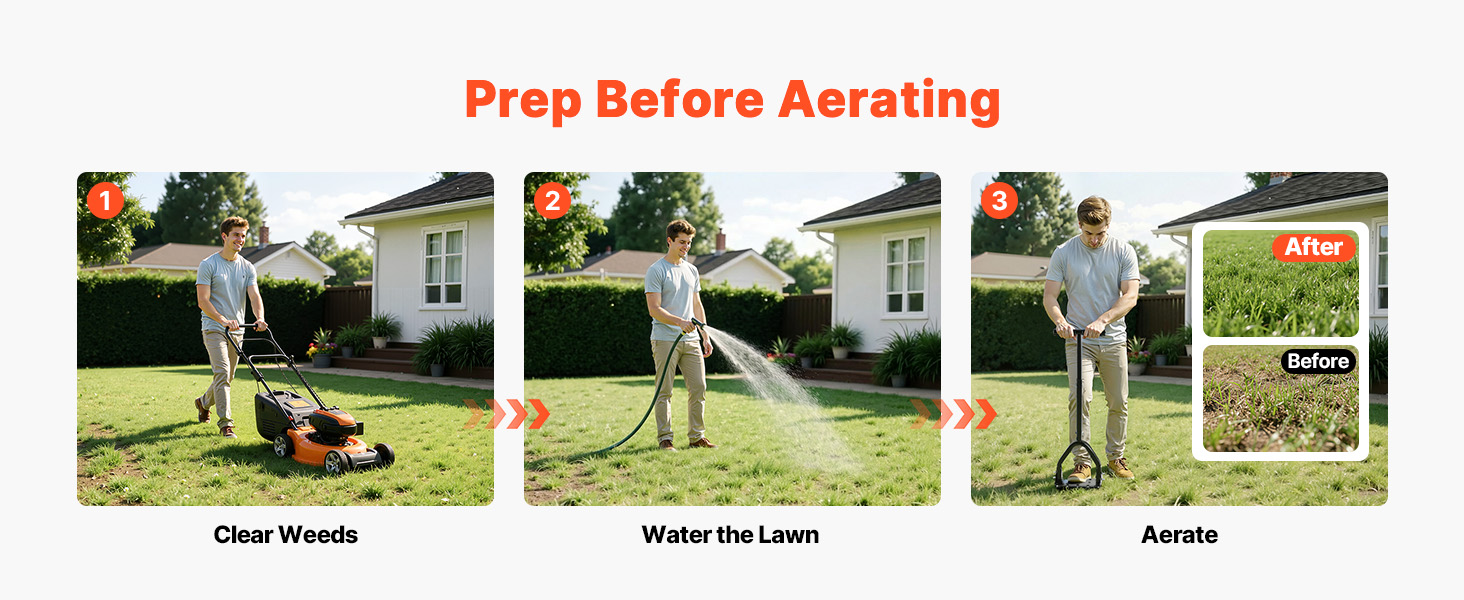 Pre dosiahnutie optimálnych výsledkov pred použitím odstráňte burinu a trávnik mierne polievajte, aby bola pôda mierne vlhká. To umožňuje prevzdušňovaču trávnika ľahšie kypríť pôdu a pomáha dodávať vzduch a živiny hlbšie do koreňového systému.