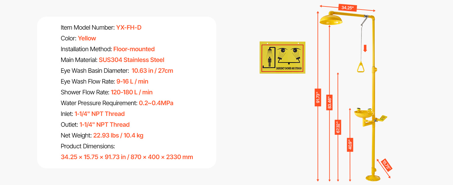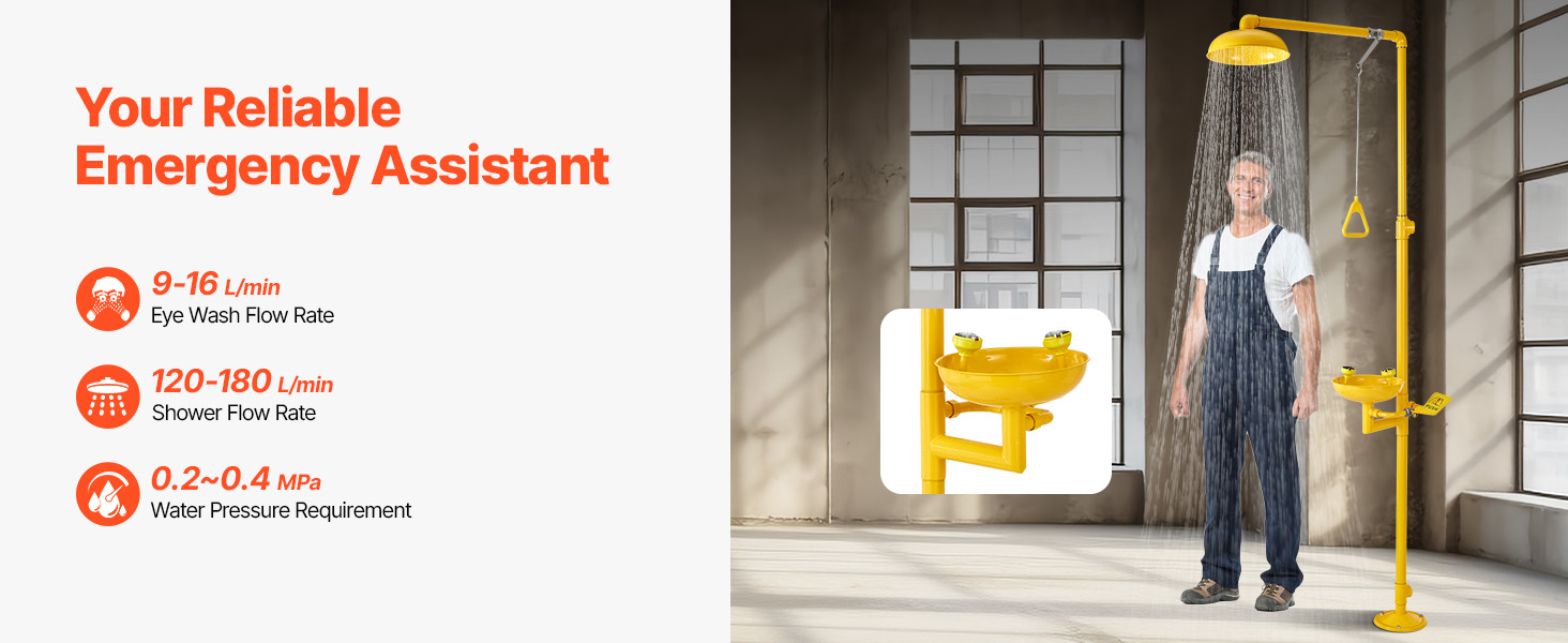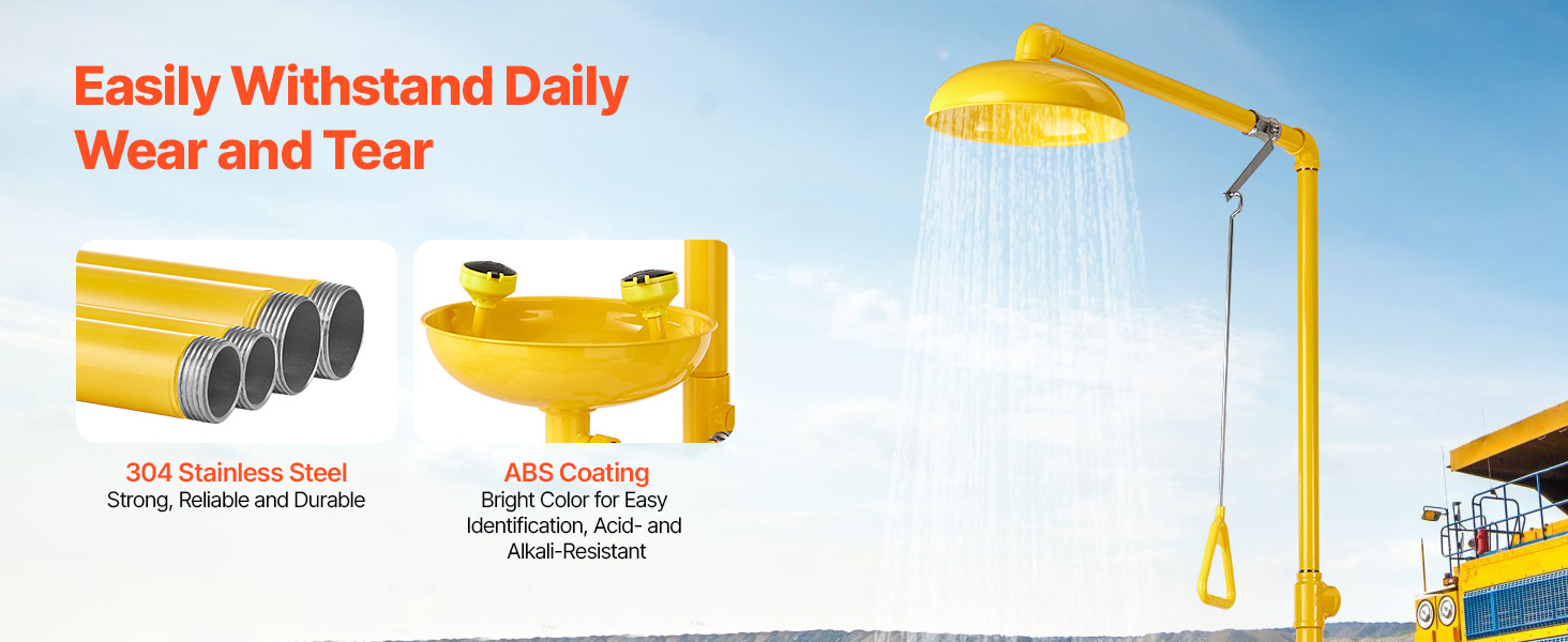 Naša stanica na umývanie očí a sprchovanie je vyrobená z nehrdzavejúcej ocele 304 s povrchovou úpravou ABS, ktorá zaručuje odolnosť. Spĺňa normy OSHA a ANSI Z358.1-2014 s prietokom na výplach očí 9-16 l/min a sprchou 120-180 l/min. Aktivuje sa do 1 sekundy pomocou ťahového krúžku alebo ručného stlačenia dosky, ideálna do školy, laboratória, továrne.