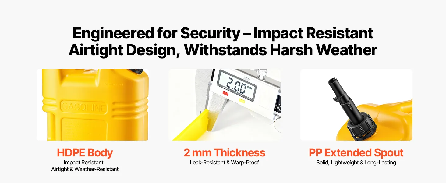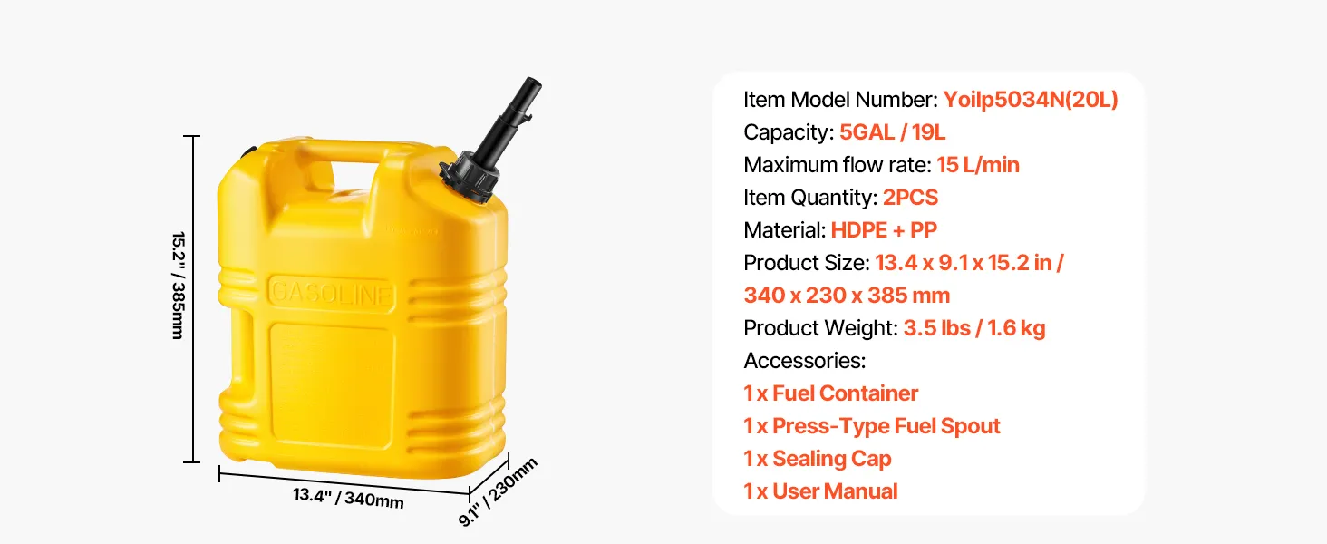 Táto prenosná nádoba na palivo je vyrobená z hrubého HDPE s 2 mm stenami pre pevnosť a odolnosť. Je vybavená nepriepustným uzáverom a výtokovou hubicou z PP na plynulé nalievanie 15 l/min. Je ideálna na autá, motocykle, výlety v teréne a použitie v prírode.