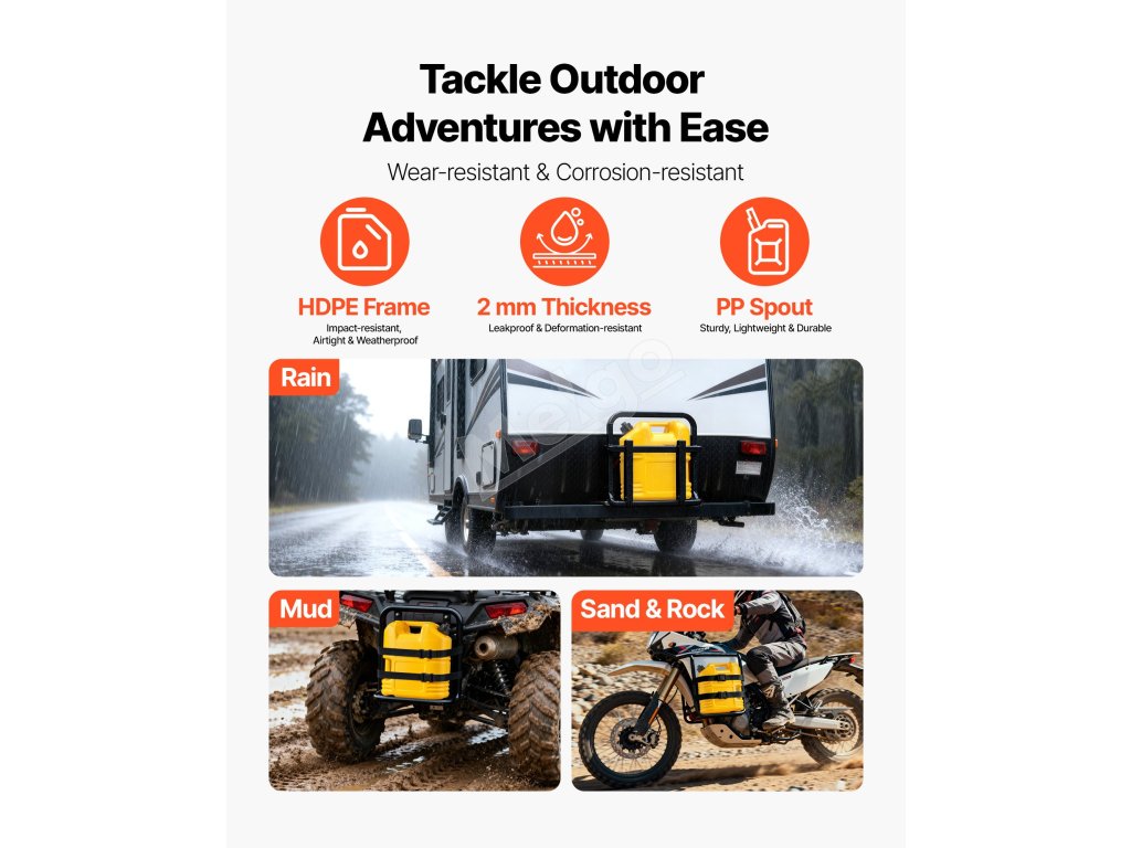 Táto prenosná nádoba na palivo je vyrobená z hrubého HDPE s 2 mm stenami pre pevnosť a odolnosť. Je vybavená nepriepustným uzáverom a výtokovou hubicou z PP na plynulé nalievanie 15 l/min. Je ideálna na autá, motocykle, výlety v teréne a použitie v prírode.