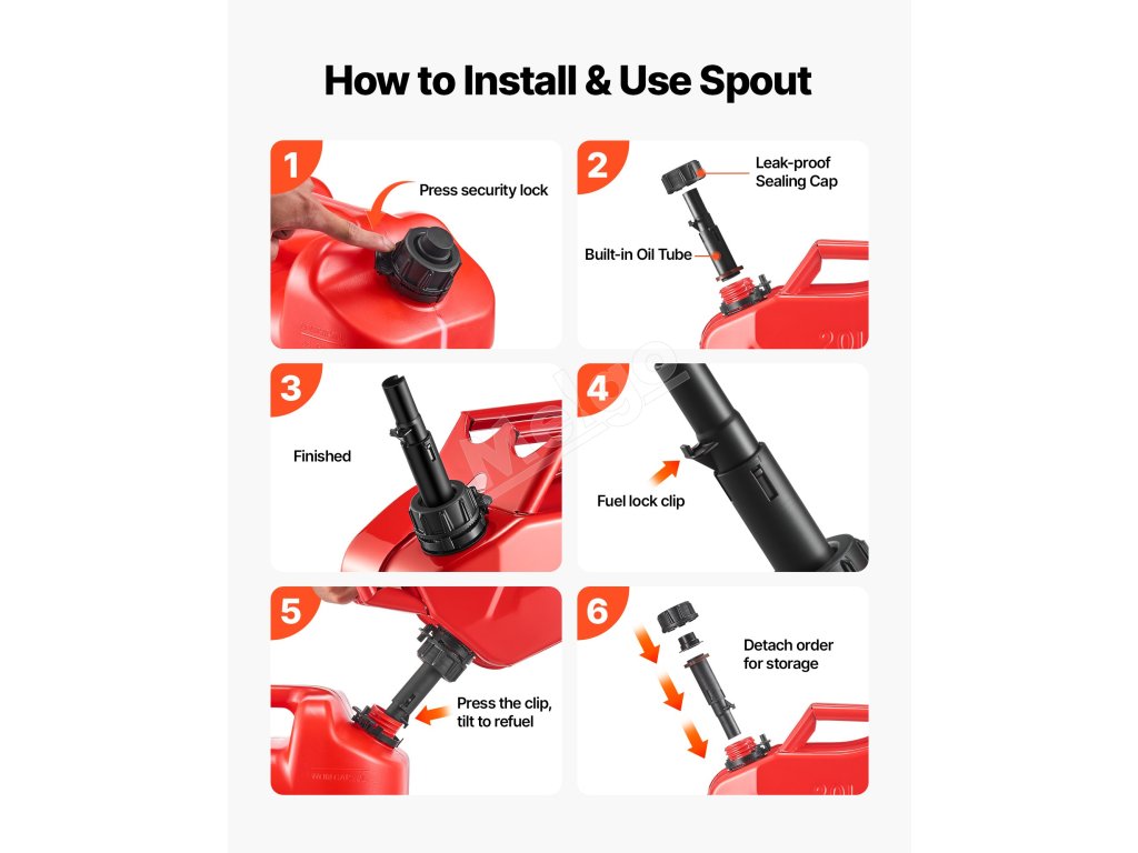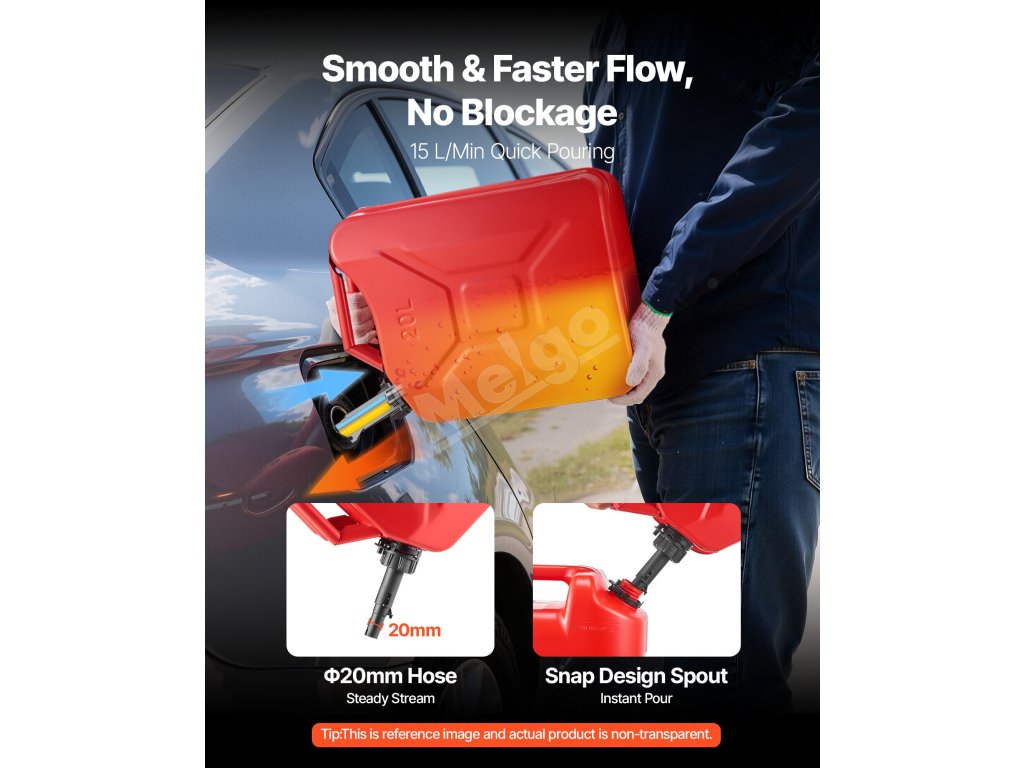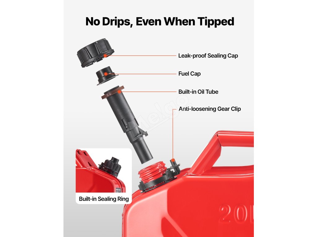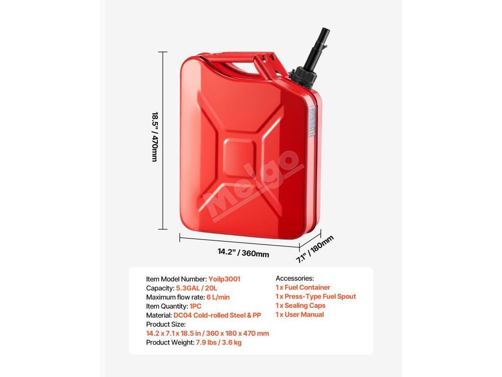 Tento prenosný kanister s objemom 20 l je vyrobený z robustného kovu s 0,8 mm stenami pre pevnosť a odolnosť. Kruh odolný proti úniku a zabudovaný výtok zabezpečujú plynulé nalievanie s rýchlosťou 6 l/min bez rozliatia. Výlevka z PP zvyšuje pohodlie, takže je ideálna pre autá, motocykle, výlety v teréne a použitie v prírode.
