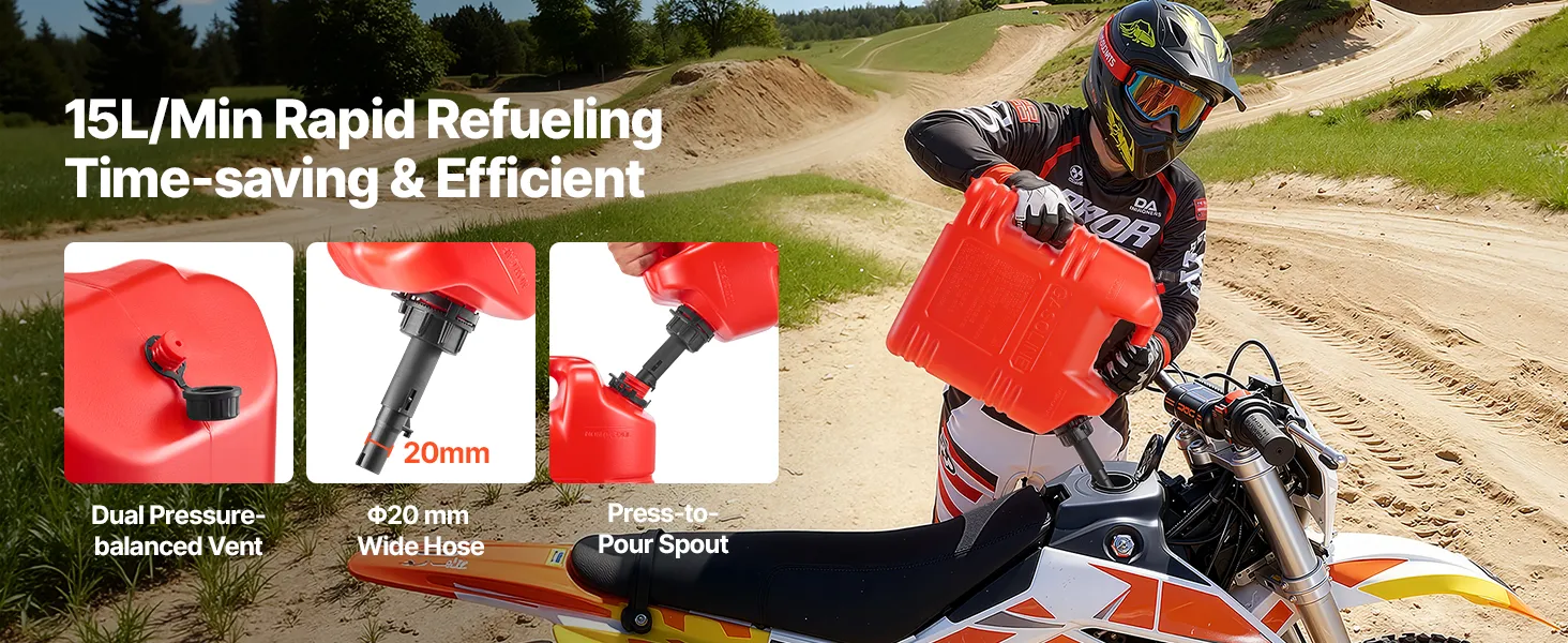 Táto prenosná nádoba na palivo je vyrobená z hrubého HDPE s 2 mm stenami pre pevnosť a odolnosť. Je vybavená nepriepustným uzáverom a výtokovou hubicou z PP na plynulé nalievanie 15 l/min. Je ideálna na autá, motocykle, výlety v teréne a použitie v prírode.