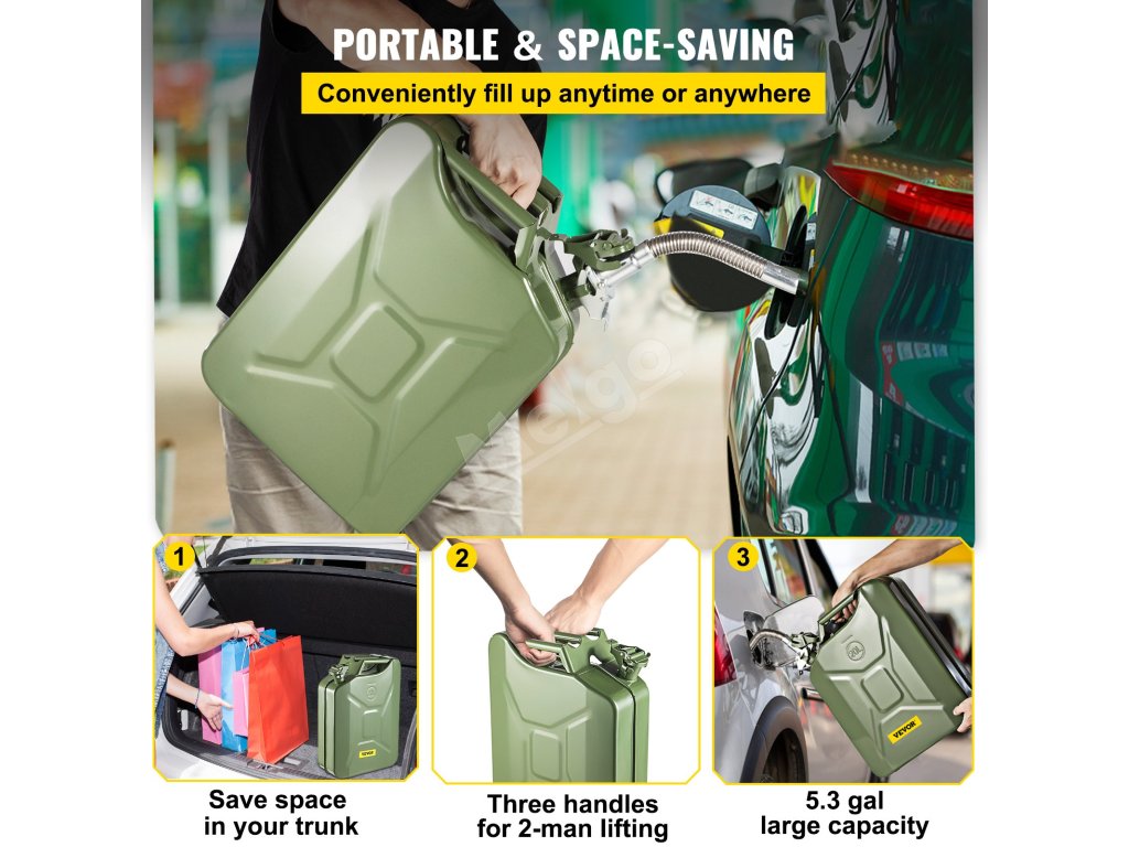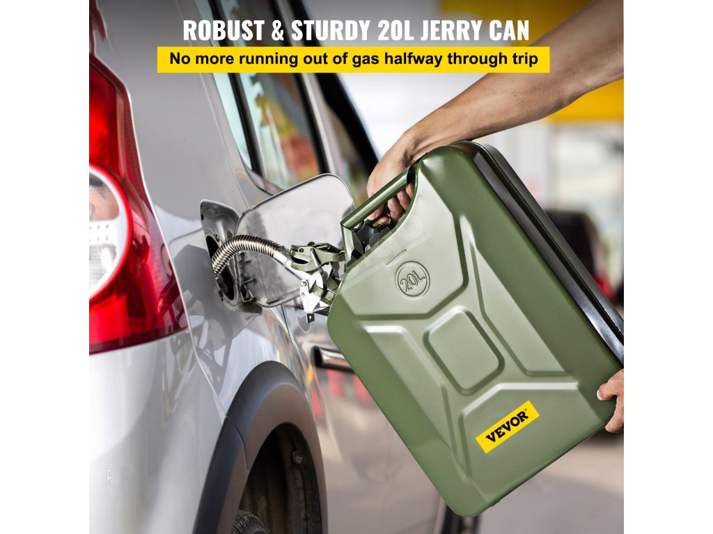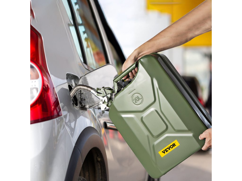 Kanister na palivo VEVOR Jerry pojme až 20 litrov paliva. S touto veľkou nádržou sa nemusíte obávať, že vám dôjde benzín na dlhých cestách, pri pracovných projektoch vonku alebo pri kempovaní. Vždy môžete mať po ruke dostatok benzínu alebo nafty na doplnenie paliva do nákladného auta, osobného auta alebo náradia. Je to vynikajúca záložná nádrž, keď jazdíte uprostred ničoho alebo pracujete ďaleko od benzínovej zastávky.