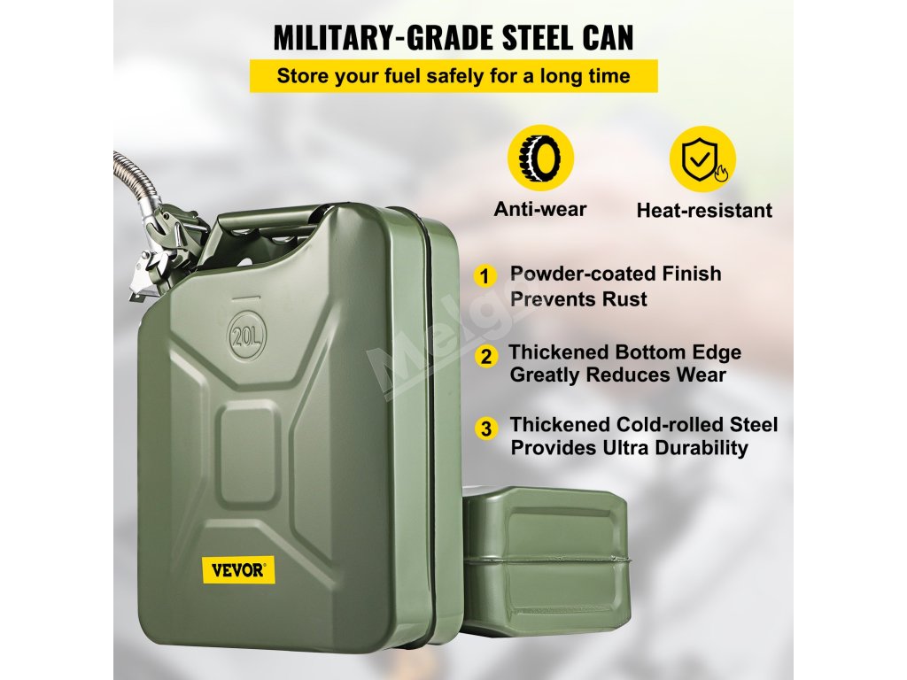 Pevná, nehrdzavejúca oceľ použitá na výrobu kanistra na palivo VEVOR ho chráni pred poškodením aj v nepriaznivom počasí. Nedegraduje na slnku, v daždi ani na snehu. Nemusíte si s tým robiť žiadne starosti. Povrchová úprava je odolná voči teplu, takže nemôže dôjsť k hrdzaveniu a korózii. Vďaka tomu zostane plechovka dlho v dobrej kondícii.