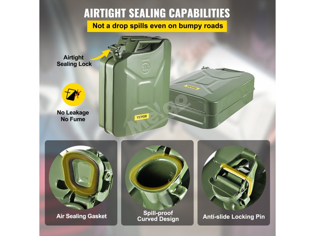 Pri výrobe kanistra na palivo VEVOR bola hlavným cieľom vaša bezpečnosť. Palivo je vo vnútri úplne utesnené krytom, ktorý zabraňuje úniku vzduchu alebo výparov. Nebudete sa musieť obávať úniku alebo zápachu, ani keď ju položíte na rovnú plochu v aute alebo nákladnom aute.