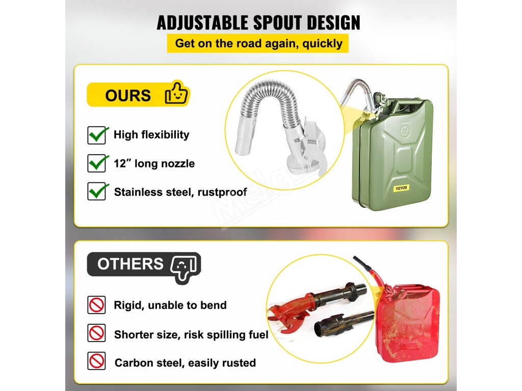 Dvanásťpalcový, ľahko ohybný výtok na kanistri na palivo VEVOR vám umožní naliať palivo bez toho, aby ste spôsobili neporiadok alebo ho vyliali. Keďže výlevku môžete nakláňať, ľahko sa dostanete k palivovým nádržiam na osobných a nákladných vozidlách a k malému náradiu. Vďaka podlhovastému tvaru je tok plynulý a stabilný a nestrieka, ani keď tankujete v úzkom alebo zvláštnom priestore.