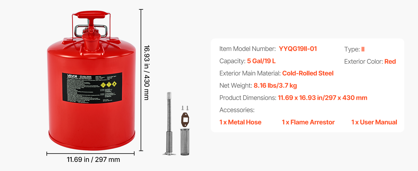 Náš 5gal červený bezpečnostný plynový kanister typu II má netesné pružinové veko, ktoré sa pri prevrátení automaticky zatvorí. Jej odolný kovový materiál je robustný a odolný voči korózii, vrátane poistky proti iskreniu, ktorá blokuje vonkajšie plamene, a presnej, hladkej plniacej hadice.