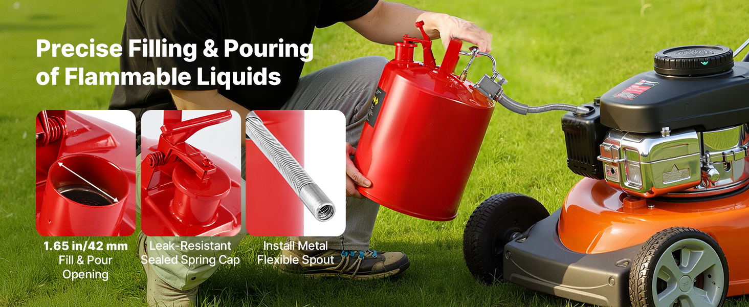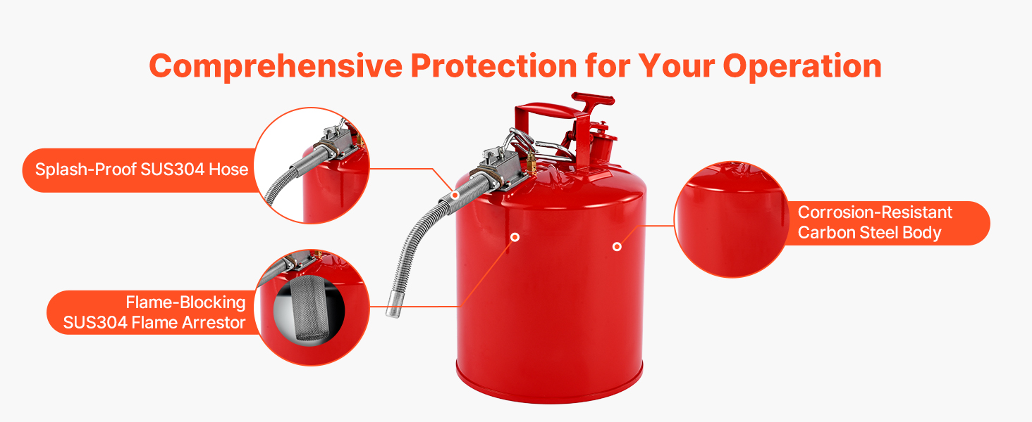Vďaka robustnému telu z uhlíkovej ocele odolnej voči korózii s poistkou proti vznieteniu SUS304 náš kovový kanister na plyn blokuje vonkajšie plamene a zabraňuje náhodnému vznieteniu kvapalín. Jej lievik s hadicou SUS304 odolnou proti striekajúcej vode a konštrukcia so širokým hrdlom zabezpečujú plynulé plnenie a nalievanie, čím zabraňujú rozstrekovaniu kvapaliny.
