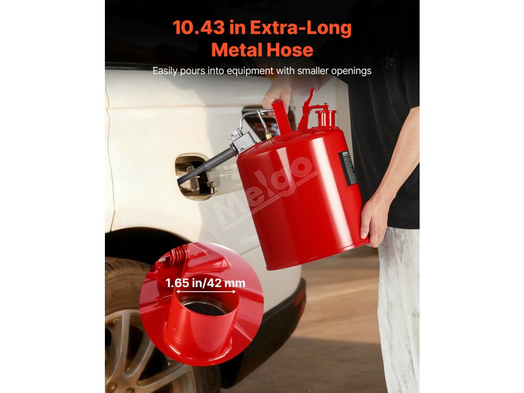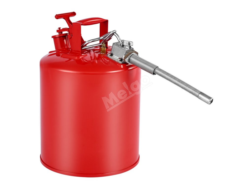 Oceľový plynový kanister je vybavený prívodom oleja s priemerom 1,65 palca/42 mm a kovovým vývodom s hadicou. V spojení s utesneným a nepriepustným pružinovým vekom zabezpečuje presné plnenie a nalievanie kvapaliny. Veko sa po prevrátení automaticky zatvorí a vytvorí tesný uzáver, ktorý zabráni úniku a vyliatiu kvapaliny.