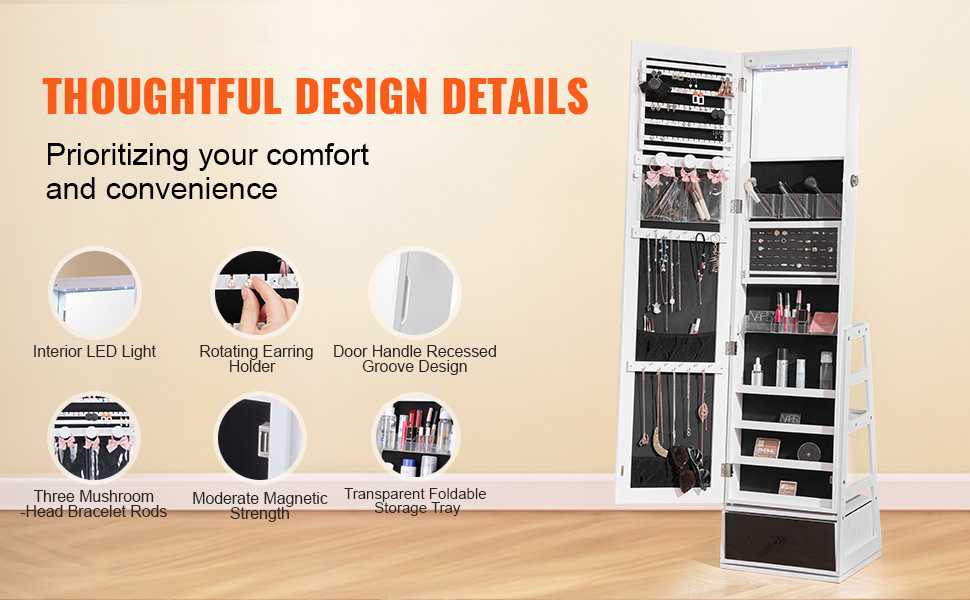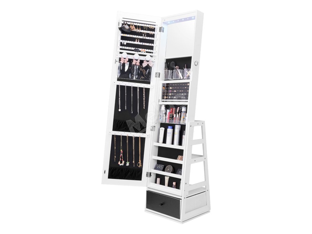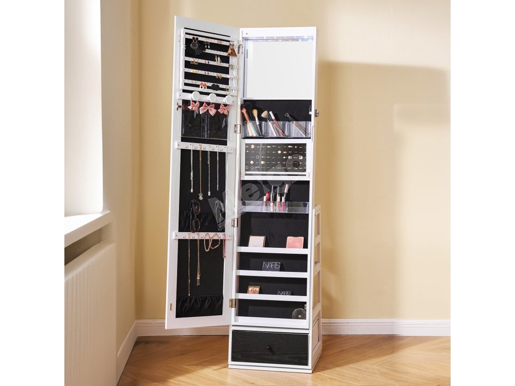 Odkladacie zrkadlo je v hornej časti vybavené LED svetlom, ktoré vám umožní ľahko nosiť šperky v tme. Otočný držiak na náušnice zabezpečuje rýchly prístup, zatiaľ čo stojan na náramky šetrí miesto. Zapustená rukoväť dvierok uľahčuje ich otváranie a ich magnetická pevnosť je ideálna na dlhodobé používanie.