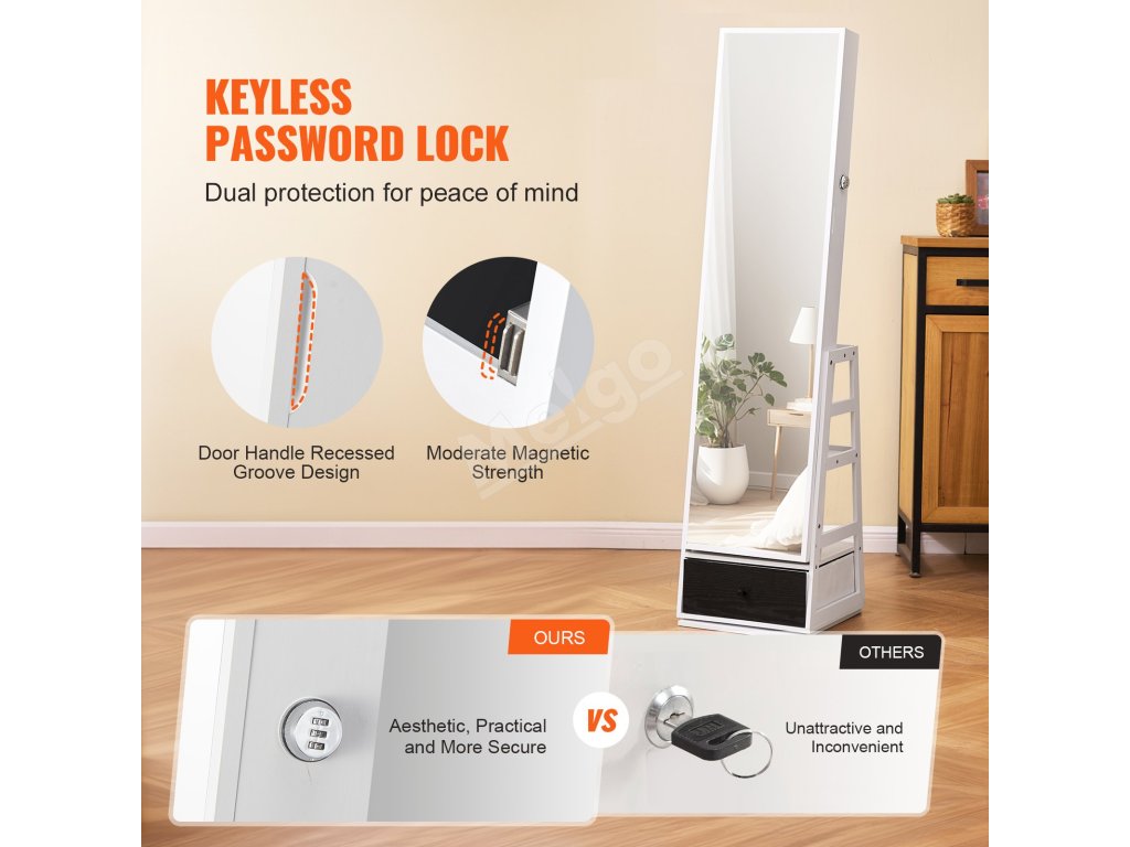 Stojanové zrkadlo na šperky je vybavené vysokokvalitnou zamatovou podšívkou, vďaka ktorej zostanú vaše náhrdelníky bez poškriabania a zamotania. Bezkľúčová konštrukcia zabraňuje strate kľúčov a zároveň chráni vaše cennosti pred hravými deťmi.