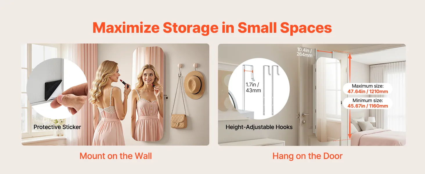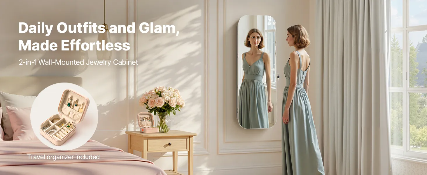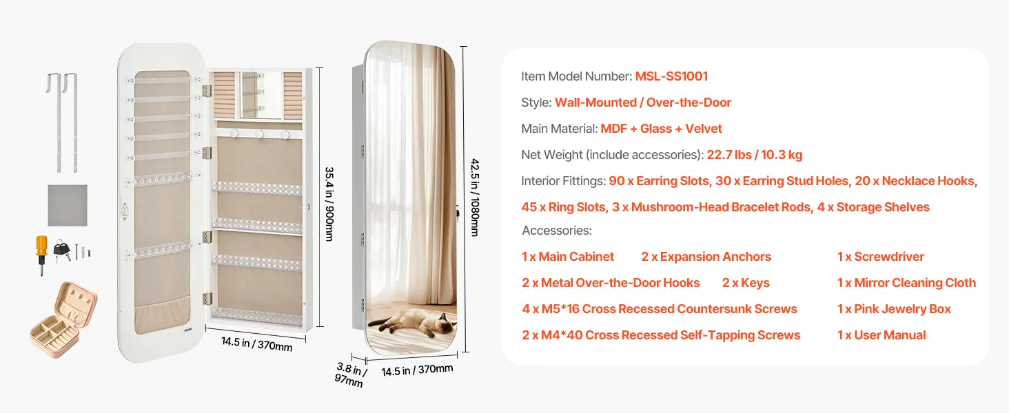 Máte už dosť zamotaných šperkov? Táto skrinka 2 v 1 udrží vaše šperky usporiadané a slúži ako zrkadlo v celej dĺžke. Jej elegantný zakrivený dizajn šetrí miesto, dodáva štýl a je ideálnym darčekom pre vašu manželku, matku, priateľku alebo kamarátku, ktorej prinesie každodennú dávku radosti vždy, keď sa pripravuje!