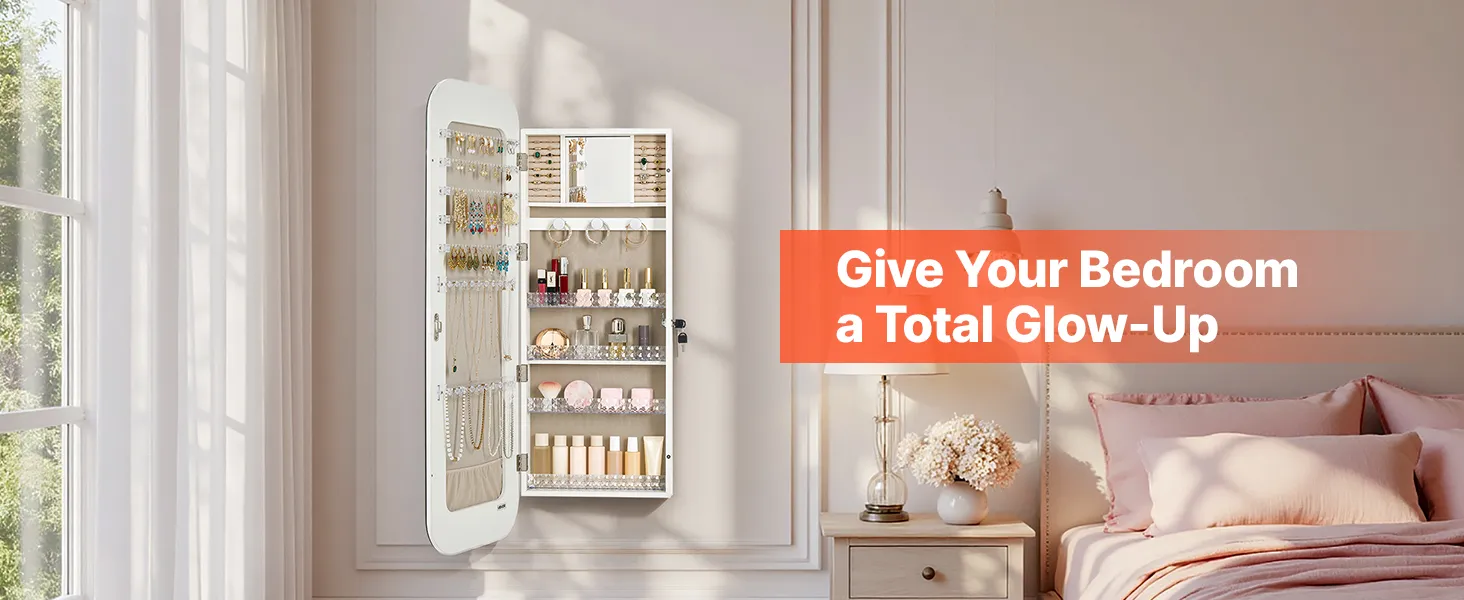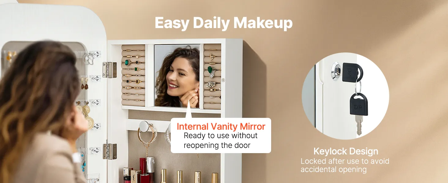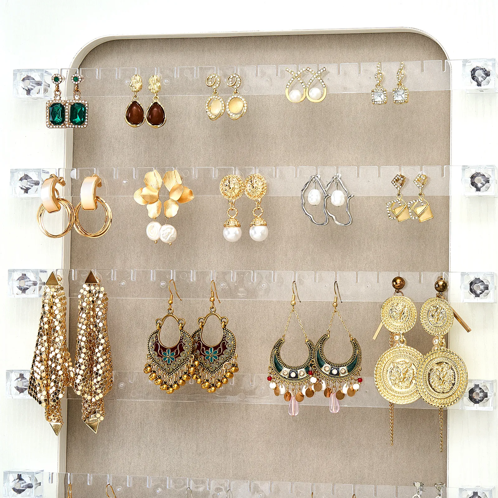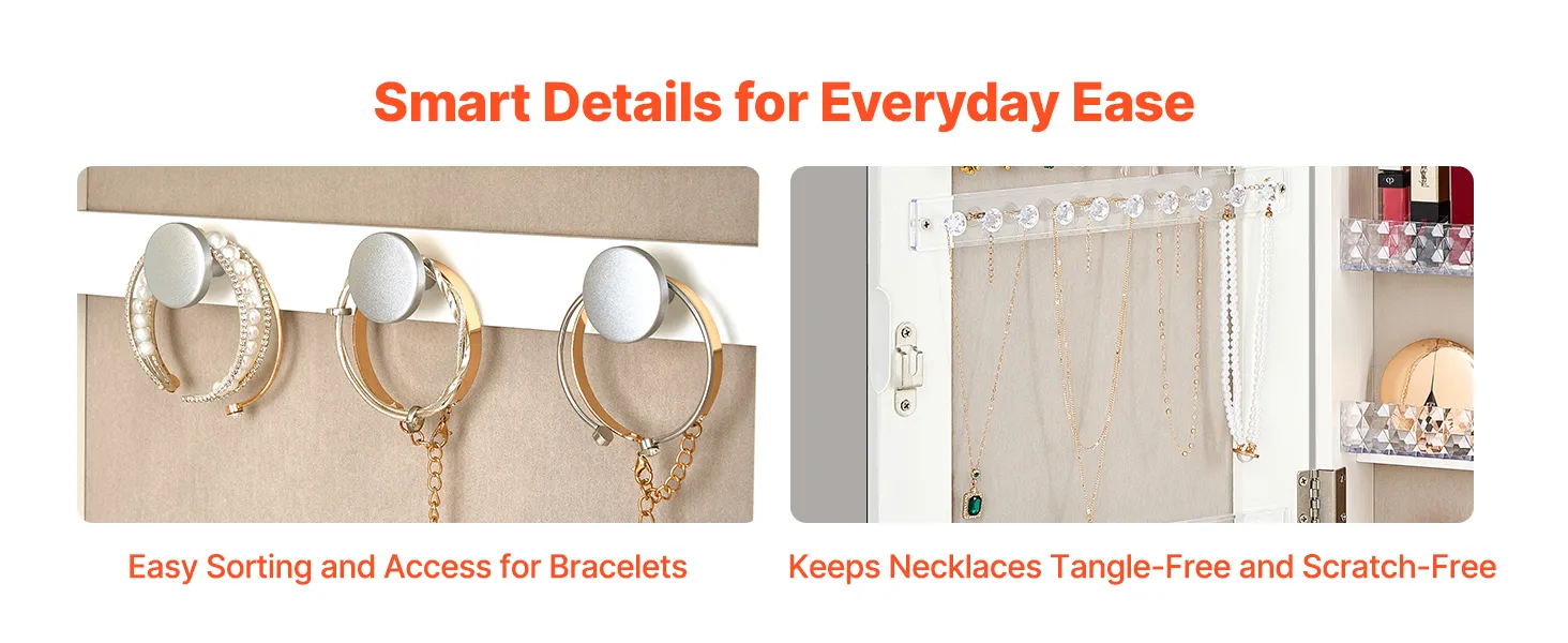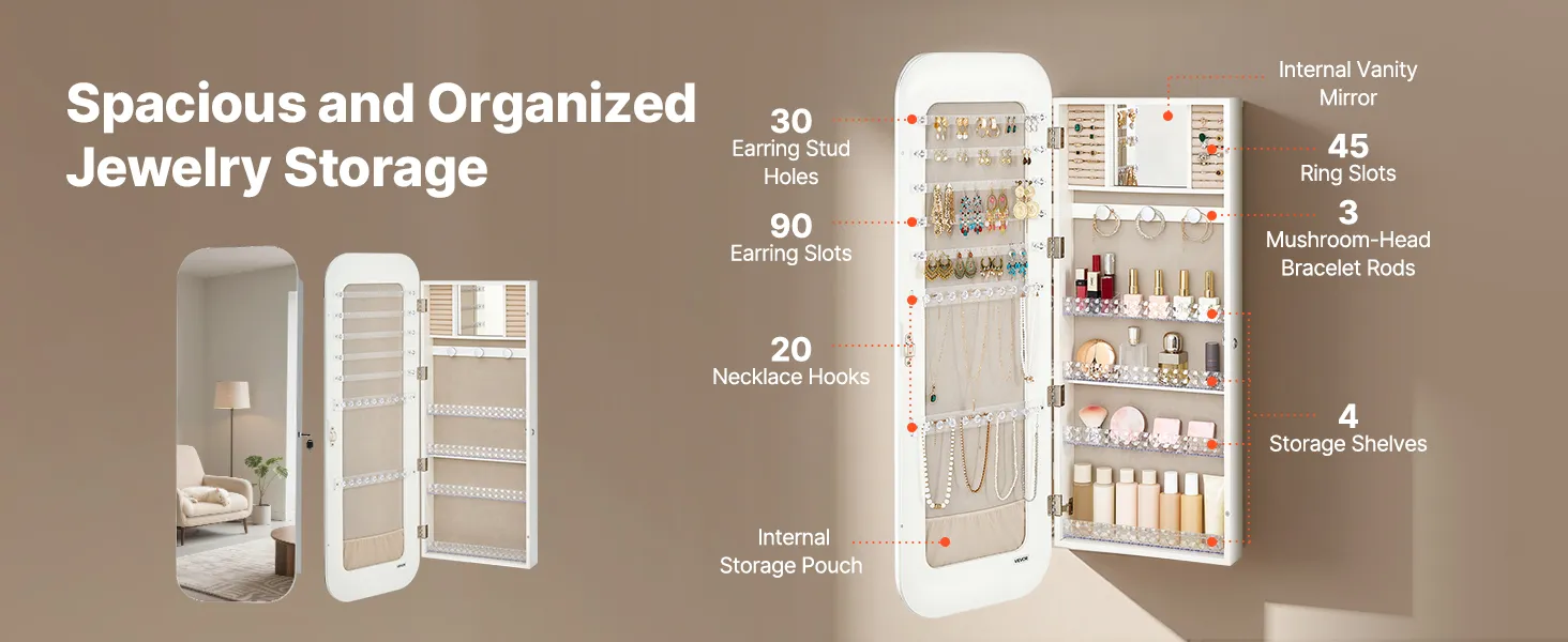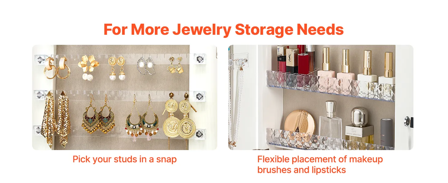 Zrkadlo s úložným priestorom je vybavené vyhradenými slotmi na náušnice a cvočky, ktoré umožňujú zavesiť a usporiadať šperky oddelene na rýchly a jednoduchý výber.