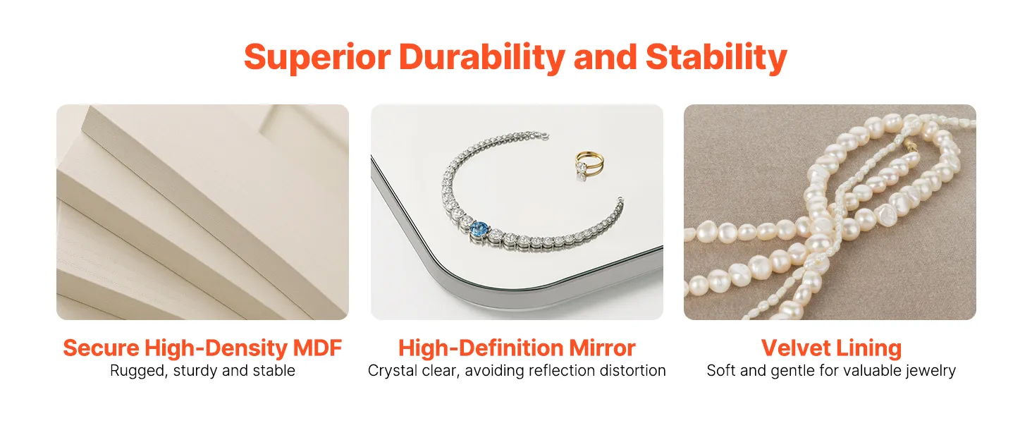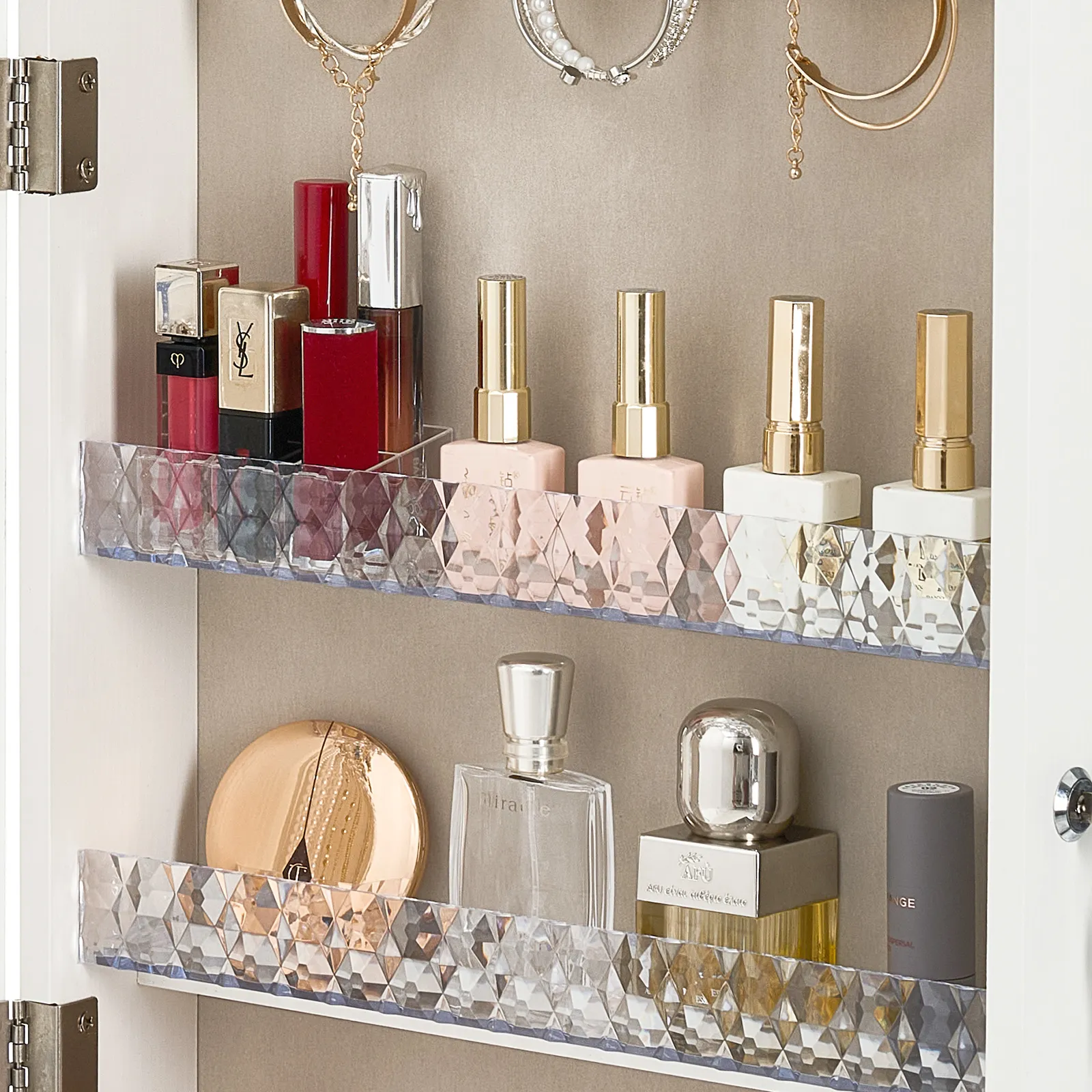 Zrkadlo s úložným priestorom na šperky obsahuje akrylové poličky na uloženie zriedkavo používaných alebo cenných predmetov, ktoré ich udržia v poriadku a bezpečí.