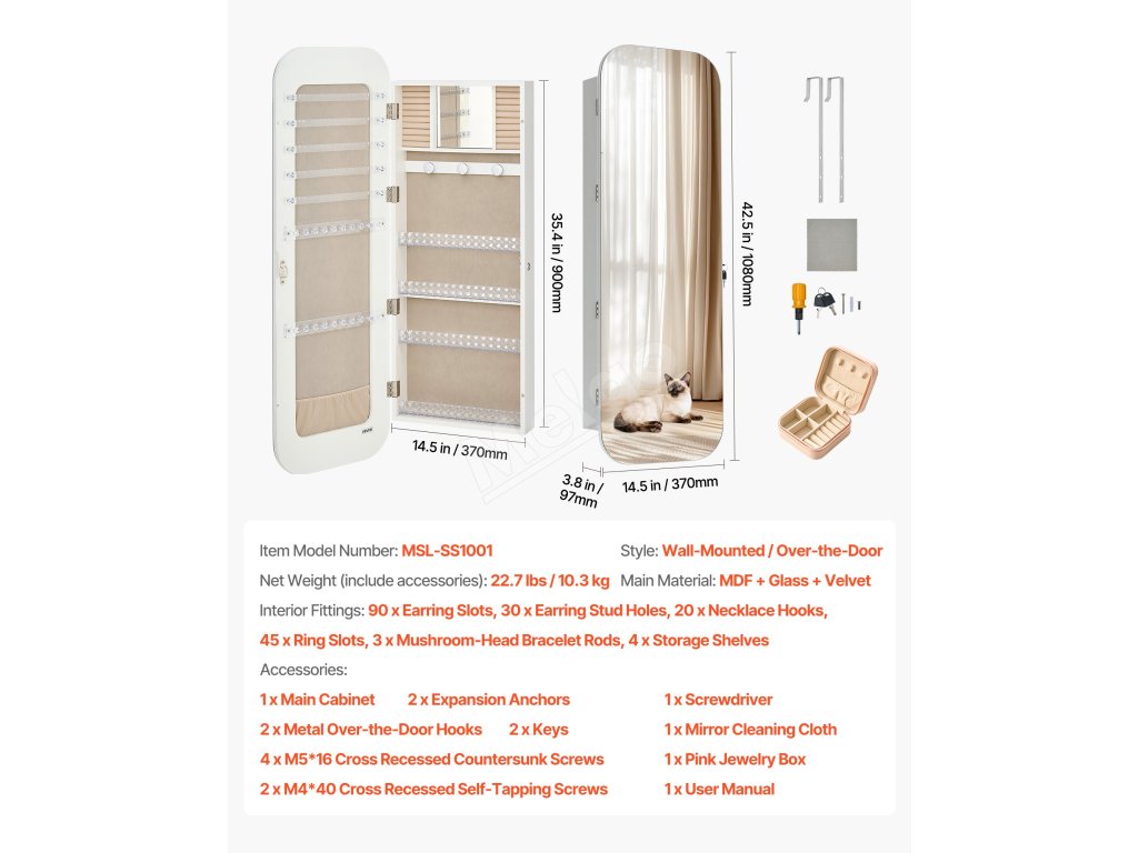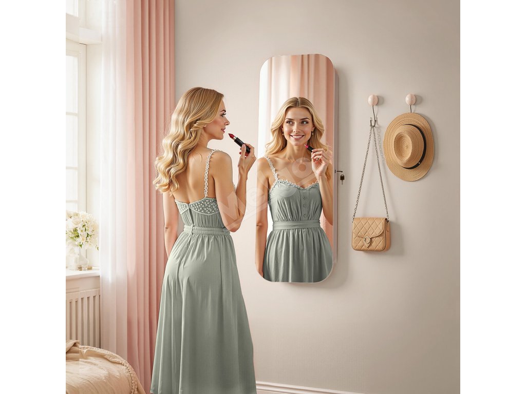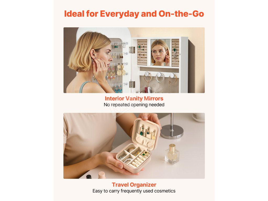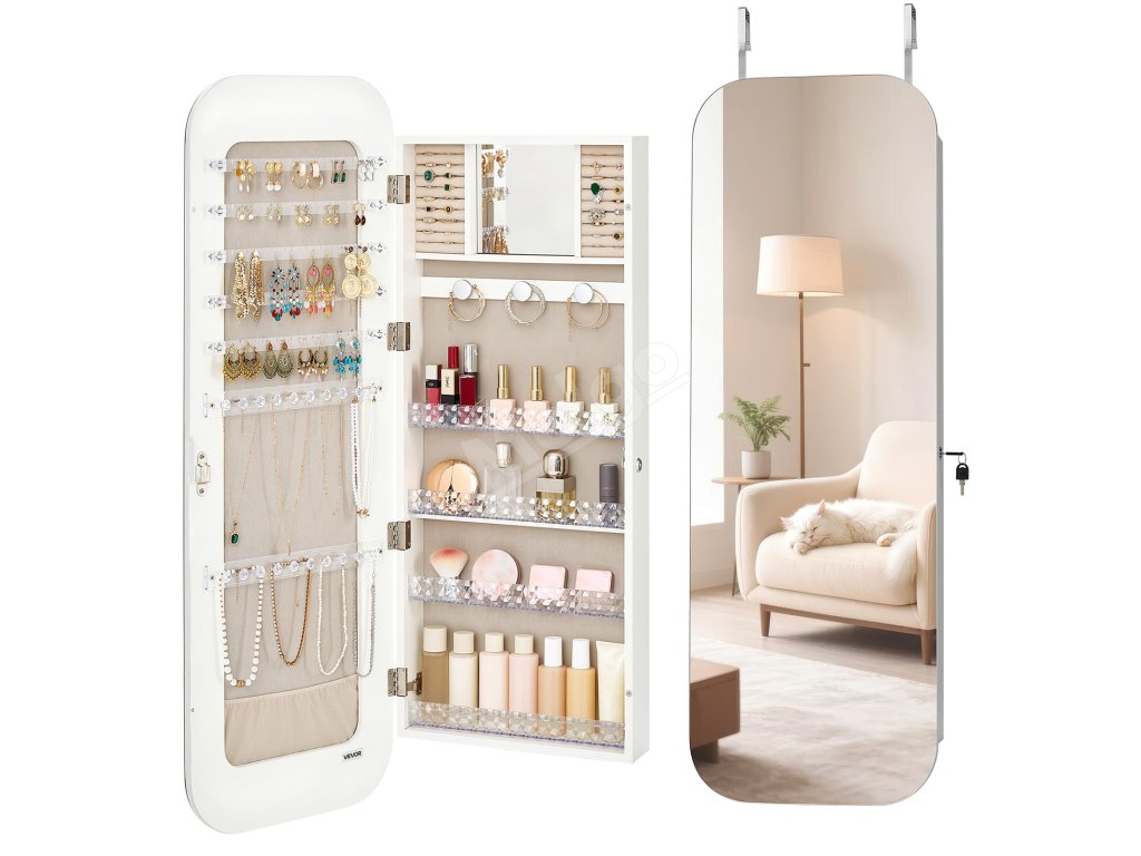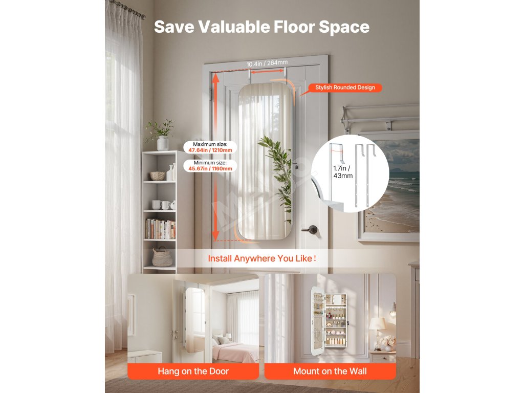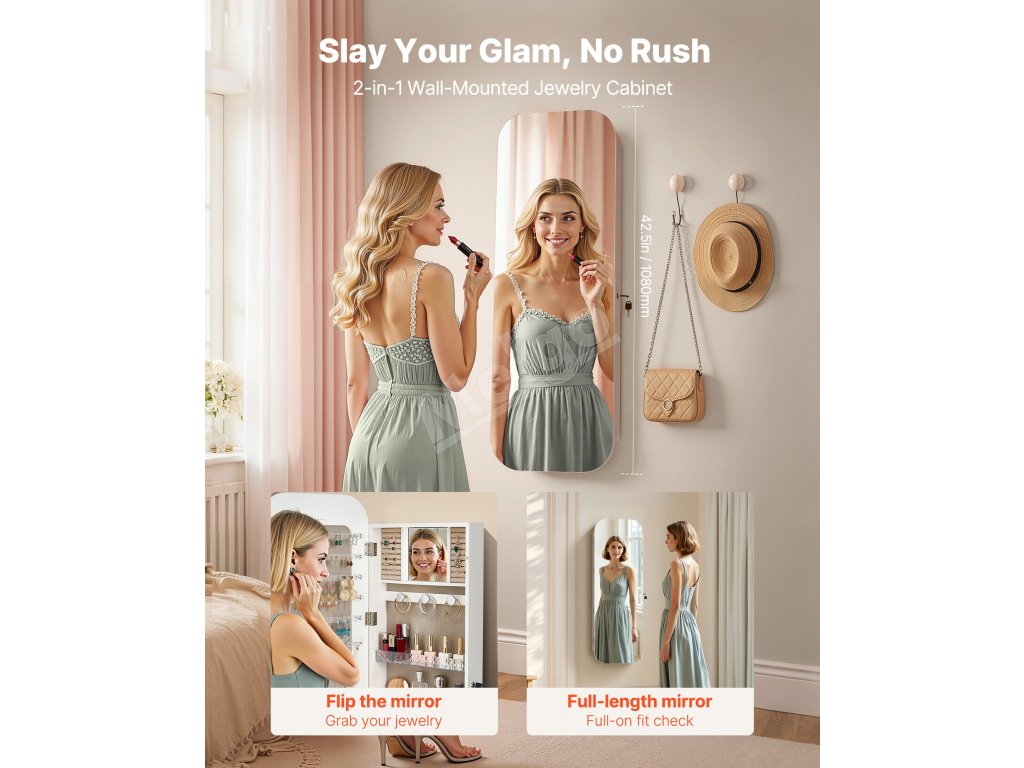 Máte už dosť zamotaných šperkov? Táto skrinka 2 v 1 udrží vaše šperky usporiadané a slúži ako zrkadlo v celej dĺžke. Jej elegantný zakrivený dizajn šetrí miesto, dodáva štýl a je ideálnym darčekom pre vašu manželku, matku, priateľku alebo kamarátku, ktorej prinesie každodennú dávku radosti vždy, keď sa pripravuje!