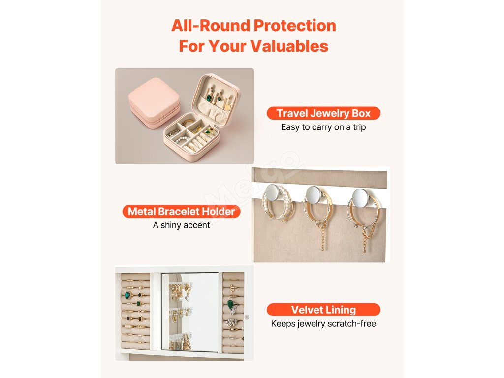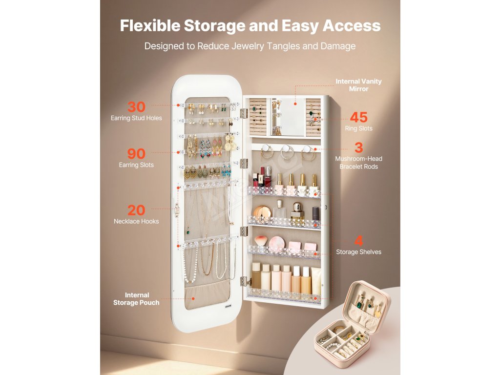 Zrkadlo s úložným priestorom je vybavené vyhradenými slotmi na náušnice a cvočky, ktoré umožňujú zavesiť a usporiadať šperky oddelene na rýchly a jednoduchý výber.