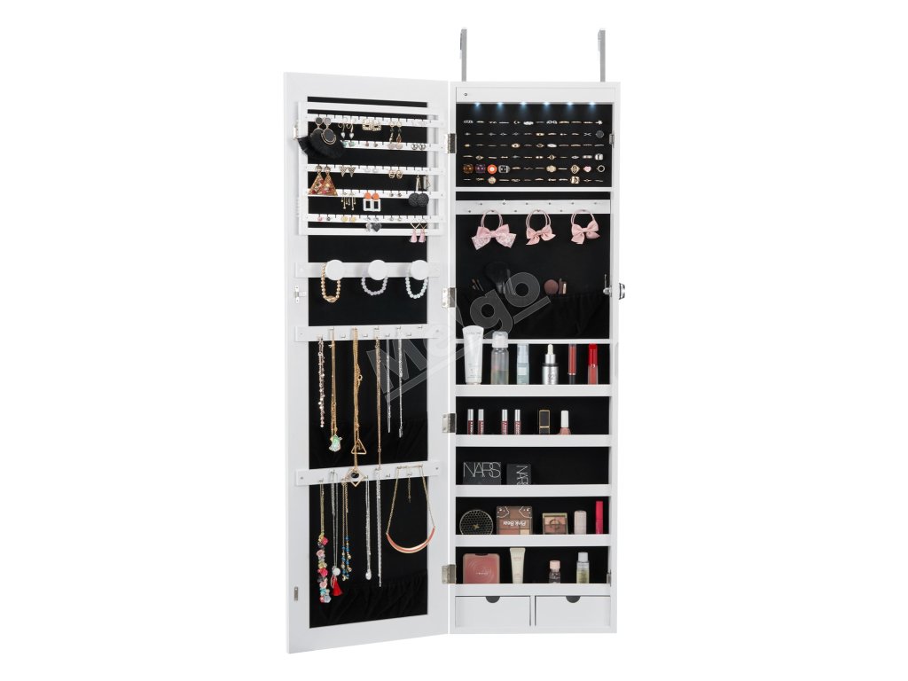 Zrkadlová skrinka je v hornej časti vybavená LED svetlom, ktoré umožňuje jednoduché nosenie šperkov v tme. Otočný držiak na náušnice zabezpečuje rýchly prístup, zatiaľ čo stojan na náramky šetrí miesto. Zapustená rukoväť dvierok uľahčuje ich otváranie a magnetická pevnosť dvierok je ideálna na dlhodobé používanie.