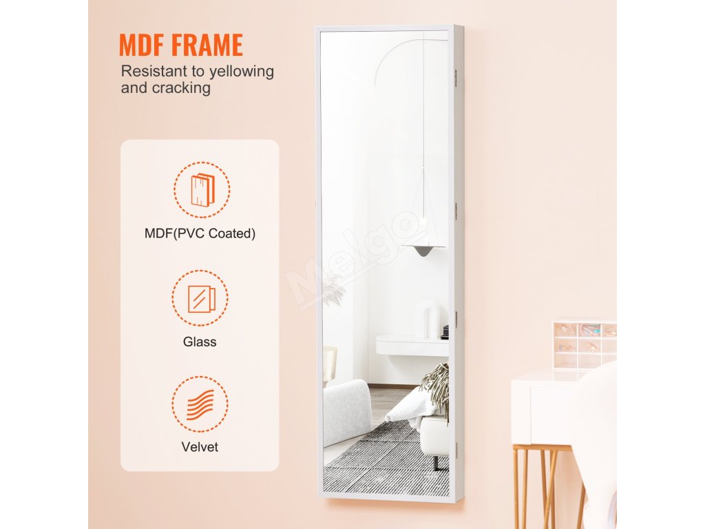 Táto nástenná zrkadlová skrinka na šperky slúži ako kombinácia zrkadla po celej dĺžke a organizéra na šperky a poskytuje čistý a priestranný priestor pre vaše každodenné šperky.
