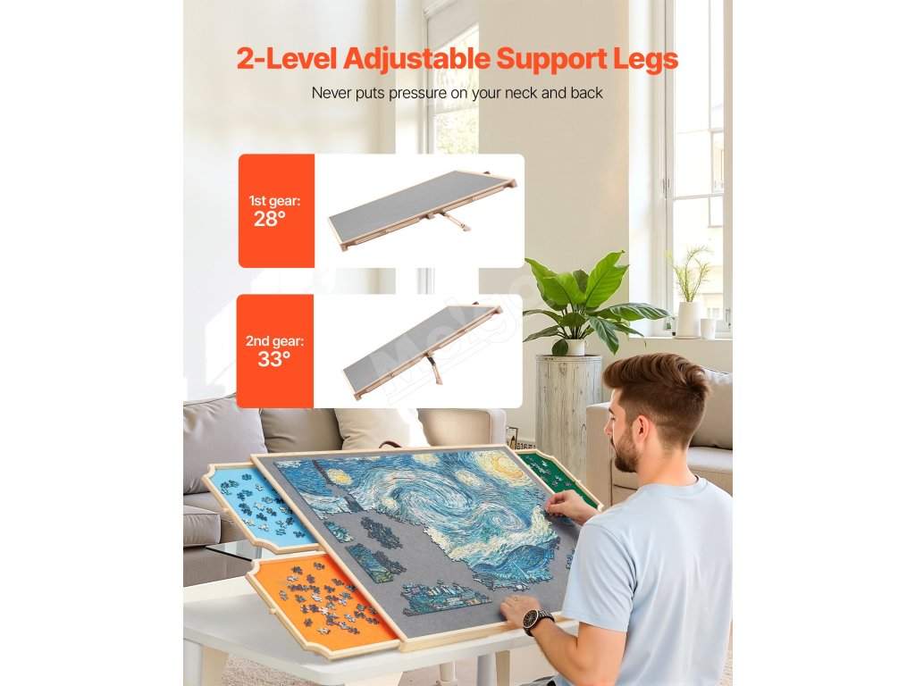 Otázka: Zmestí sa do tejto dosky na puzzle 1500 dielikov?Odpoveď: Táto doska na puzzle je určená pre štandardné veľkosti puzzle s 1500 dielikmi. Plocha na puzzle má rozmery 865 × 635 mm / 34 × 25 palcov, čo vyhovuje väčšine 1500-dielnych puzzle. otázka: Ako môžem puzzle po dokončení uložiť? odpoveď: Prenosná doska na puzzle je vybavená priehradkami na ukladanie puzzle, v ktorých možno dieliky puzzle triediť. Po dokončení sa dá zložiť na uskladnenie alebo zakryť ochranným vekom, čo umožňuje jeho vystavenie ako dekoratívneho rámu. otázka: Aká stabilná je doska stola? odpoveď: Doska stola je vyrobená z prírodného borovicového dreva, ktoré ponúka stabilnú štruktúru, ktorá vydrží pohyb počas skladania puzzle a udrží puzzle neporušené. otázka: Je montáž zložitá? odpoveď: Organizér puzzle je navrhnutý na okamžité použitie po vybalení z krabice, takže je ideálny na kempovanie, cestovanie a iné prenosné aktivity.