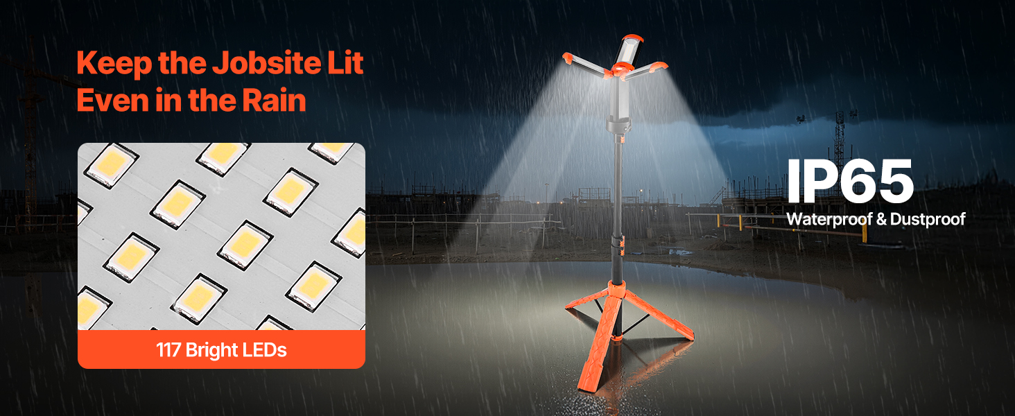 Naše bezdrôtové pracovné svetlo má vodotesnú a prachotesnú konštrukciu so stupňom krytia IP65. Je vybavené 117 vysoko svietivými LED žiarovkami, ktoré zabezpečujú stabilnú prevádzku s vysokým jasom aj počas daždivých dní.