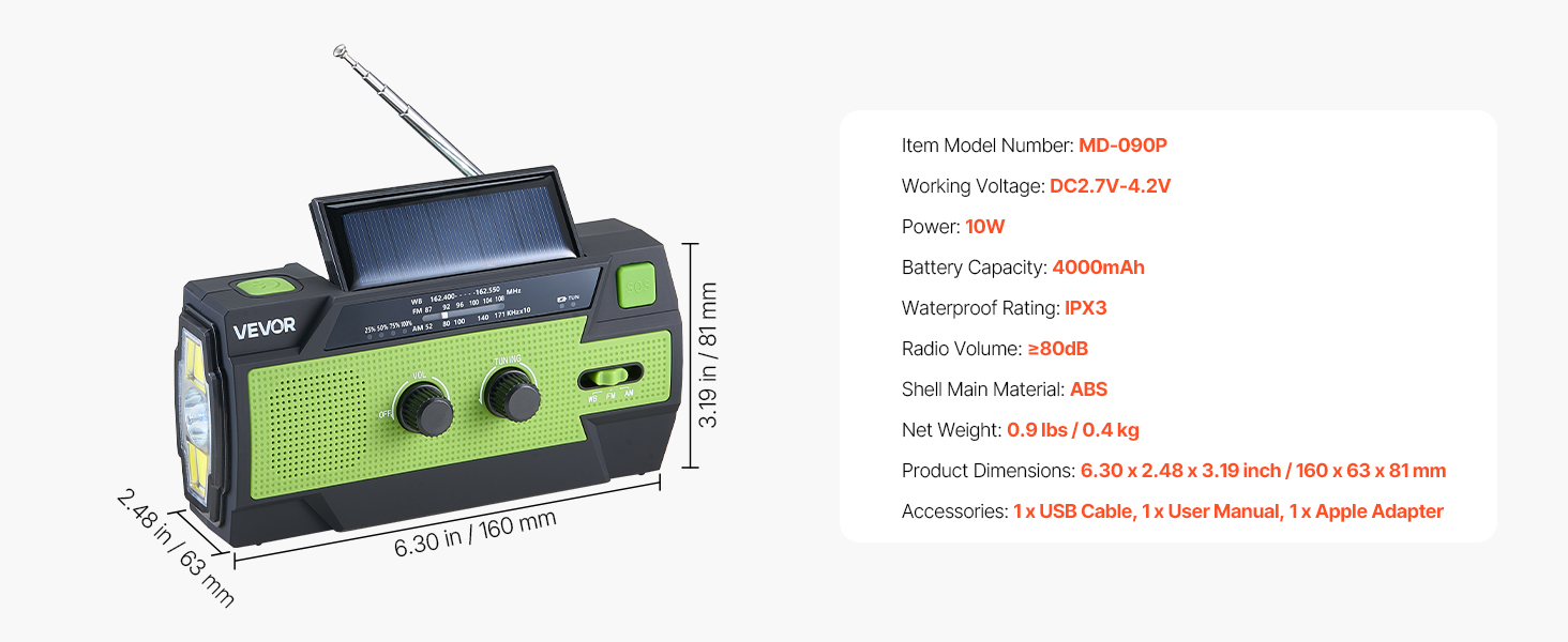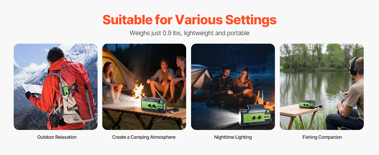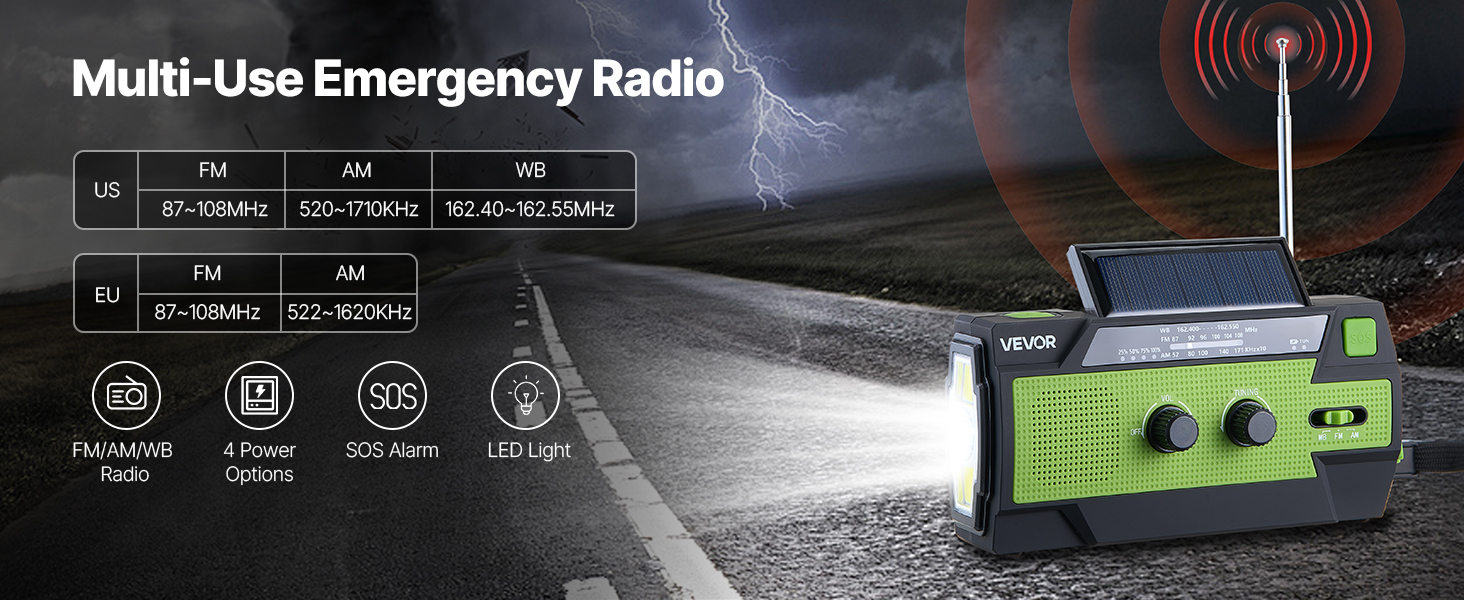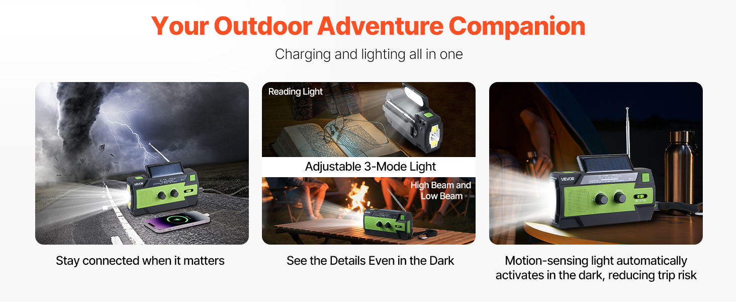 Toto núdzové rádio v sebe spája baterku, funkciu nabíjania a funkciu snímača pohybu v jednom zariadení. Je navrhnuté na núdzové použitie aj na užívanie si života v prírode, je ideálne na kempovanie, turistiku a prieskum divočiny.