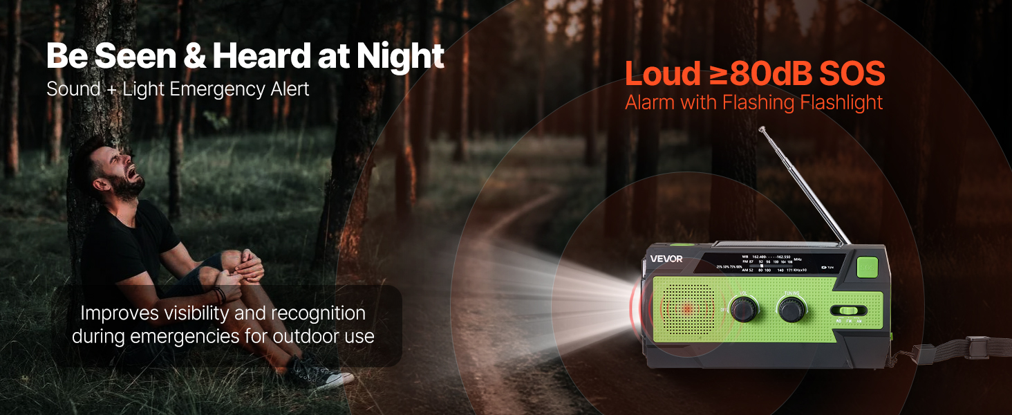 Zabudovaný vysokodecibelový SOS alarm s blikajúcim svetlom zabezpečuje, aby ste boli v noci počas núdzových situácií lepšie viditeľní. Toto núdzové meteorologické rádio NOAA zvyšuje vaše šance na rýchlu záchranu a pomáha vám rýchlejšie sa dostať z nebezpečenstva.
