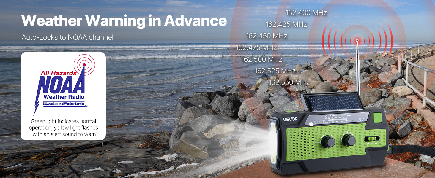 Toto ručné kľukové núdzové rádio sa automaticky zameriava na kanály NOAA s jasným príjmom zeleného svetla a výstražnými indikátormi žltého svetla. Buďte pripravení na hurikány, tornáda, cunami, záplavy a iné extrémne podmienky vďaka včasným výstrahám ešte pred ich úderom.