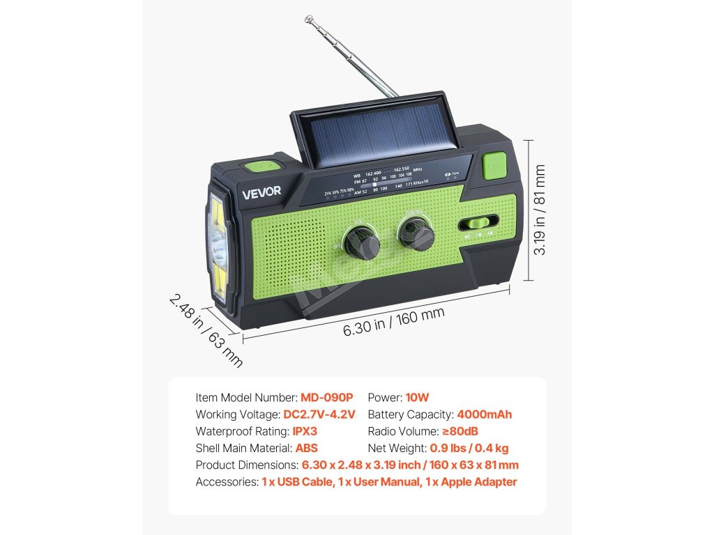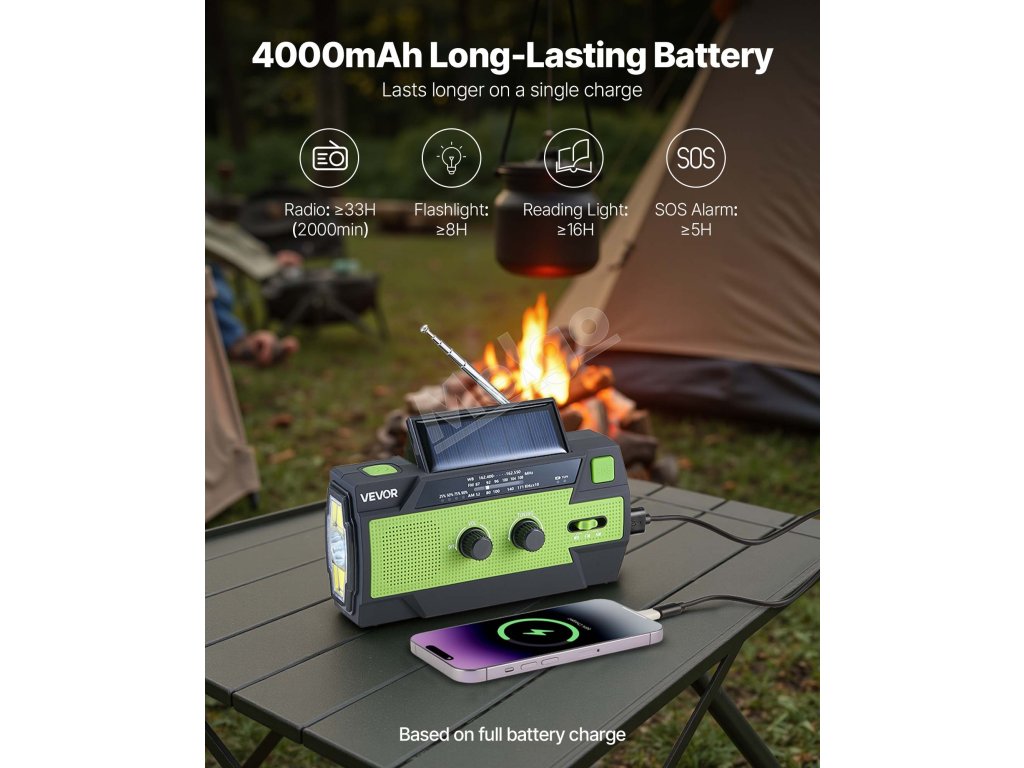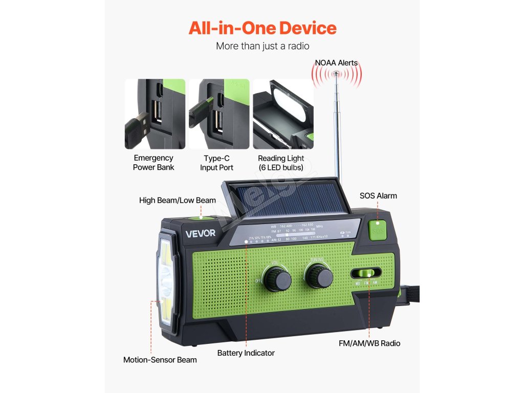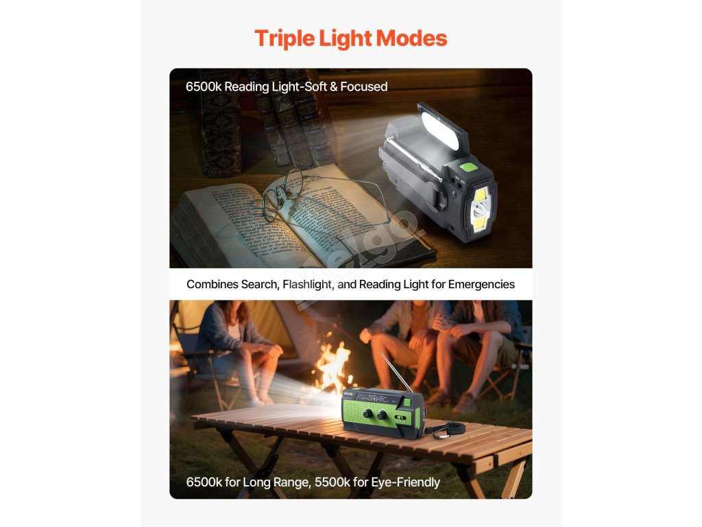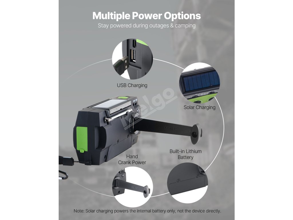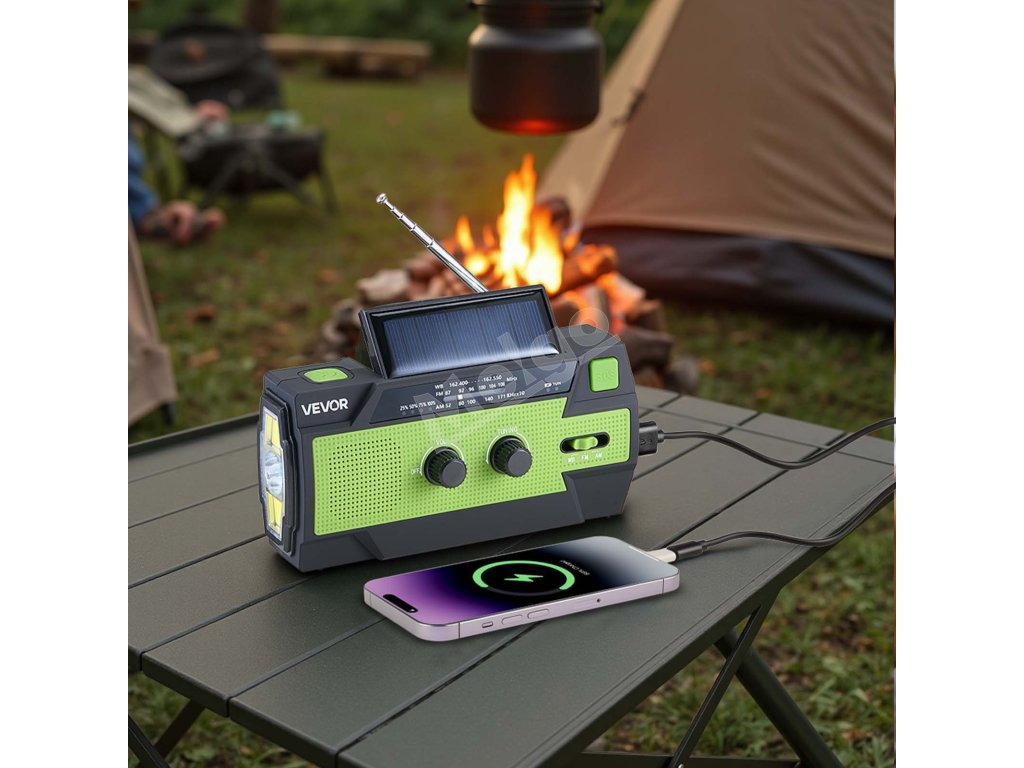 Toto núdzové rádio v sebe spája baterku, funkciu nabíjania a funkciu snímača pohybu v jednom zariadení. Je navrhnuté na núdzové použitie aj na užívanie si života v prírode, je ideálne na kempovanie, turistiku a prieskum divočiny.