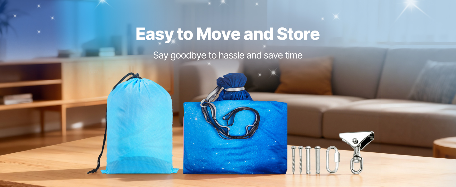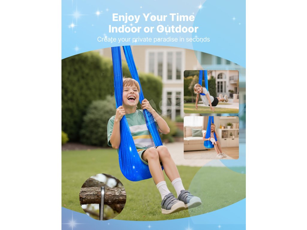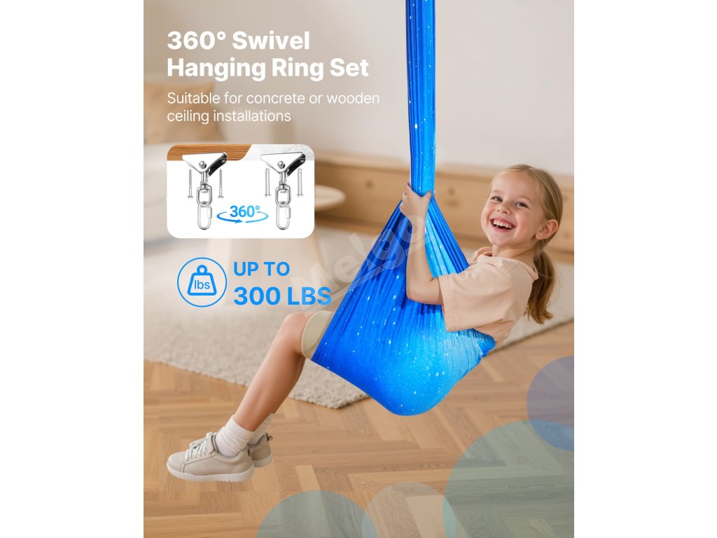 Každý detail tejto interiérovej a exteriérovej zmyslovej hojdačky je starostlivo spracovaný. Protišmykové objímky zvyšujú stabilitu, tkanina sa dá prať v práčke a matné PE úložné vrecko obsahuje výstražný štítok na jednoduché prenášanie. Rýchla montáž vám umožní začať s leteckou jogou bez meškania.