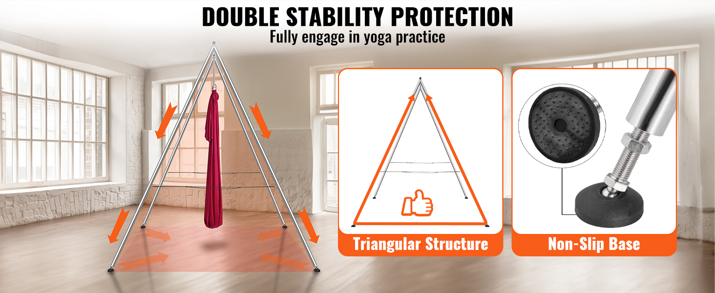 Náš rám stojana na vzdušnú jogu sa môže pochváliť premysleným dizajnom s trojuholníkovou konštrukciou a protišmykovou základňou, ktorá poskytuje dvojitú ochranu pred kolísaním. Cíťte sa bezpečne v každej pozícii a počas cvičenia sa vám bude ľahko dýchať.
