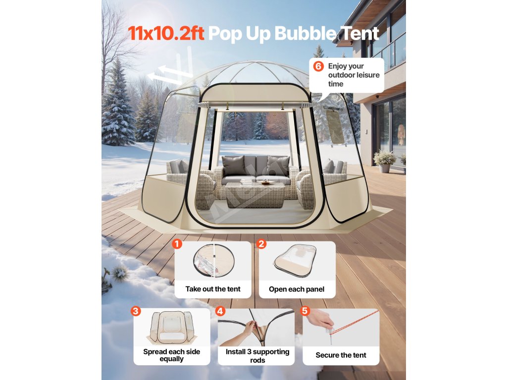 Tento pop-up bublinový stan pre 8 až 10 osôb je vyrobený z TPU a tkaniny 210D Oxford s oceľovým drôtom pre stabilitu a odolnosť. Pop-up konštrukcia umožňuje rýchle postavenie v priebehu niekoľkých sekúnd, takže je ideálny na použitie v exteriéri alebo na dvore. Viaceré rolovacie bočné okná umožňujú jednoducho regulovať prúdenie vzduchu a súkromie.