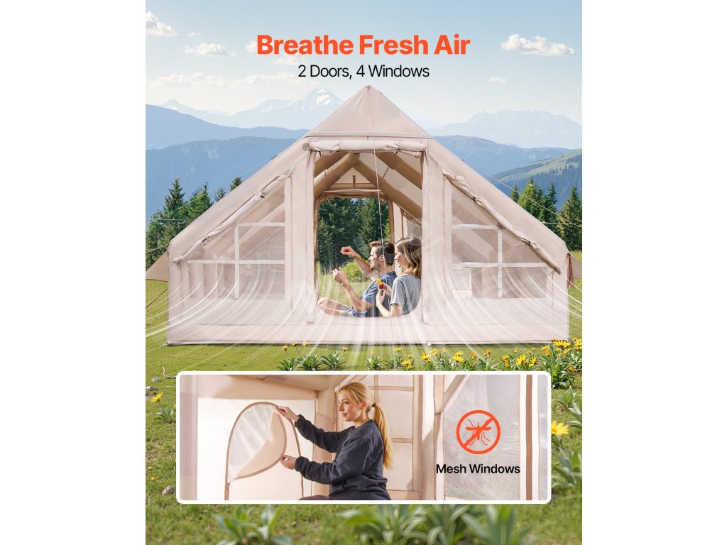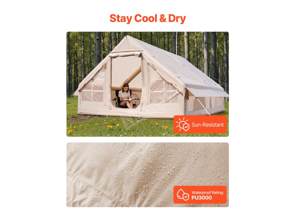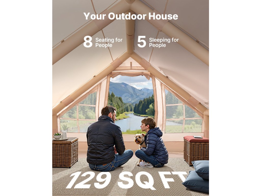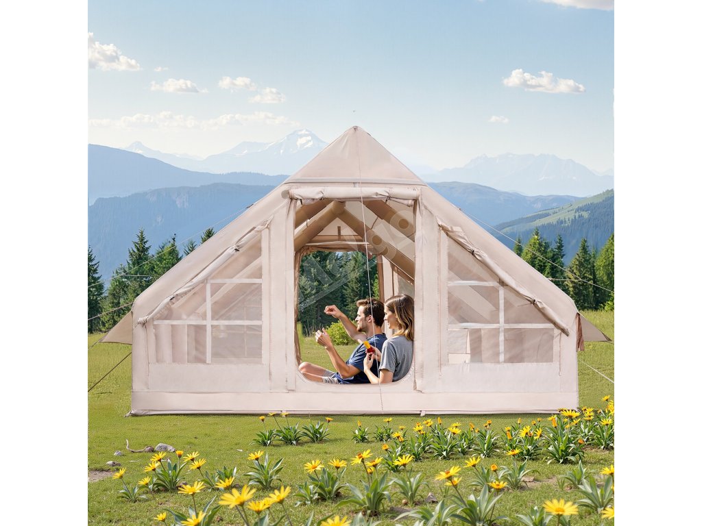 Glampingový stan ponúka 129 m² priestoru, ktorý je ideálny pre rodinu alebo priateľov. Či už ide o kempingovú výbavu alebo relaxáciu s blízkymi, tento nafukovací stan vytvorí súkromné, pohodlné útočisko na dobrodružstvá v prírode.