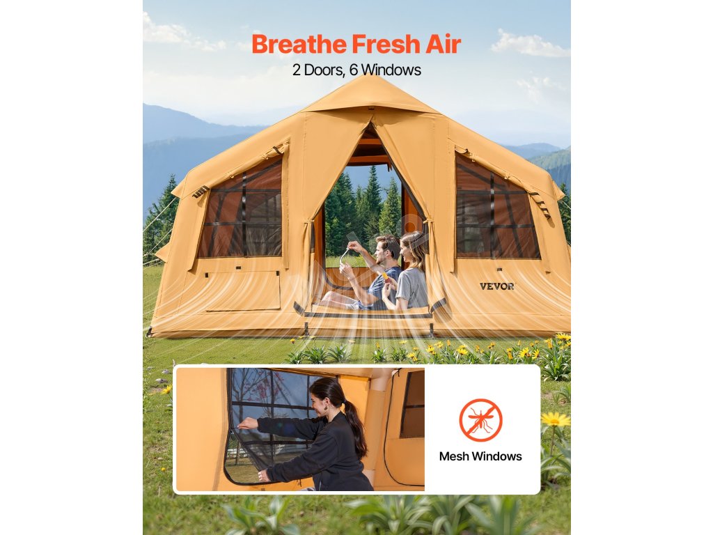 Tento nafukovací stan s vonkajším priestorom 186 m² je ideálny na rodinné alebo skupinové kempovanie. Či už umiestňujete stoličky, nafukovacie matrace alebo si jednoducho užívate čas s rodinou, tento stan vytvára súkromný priestor v prírode.