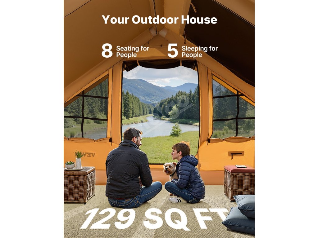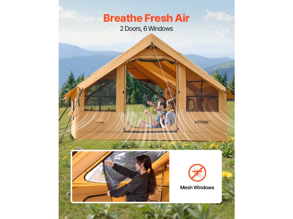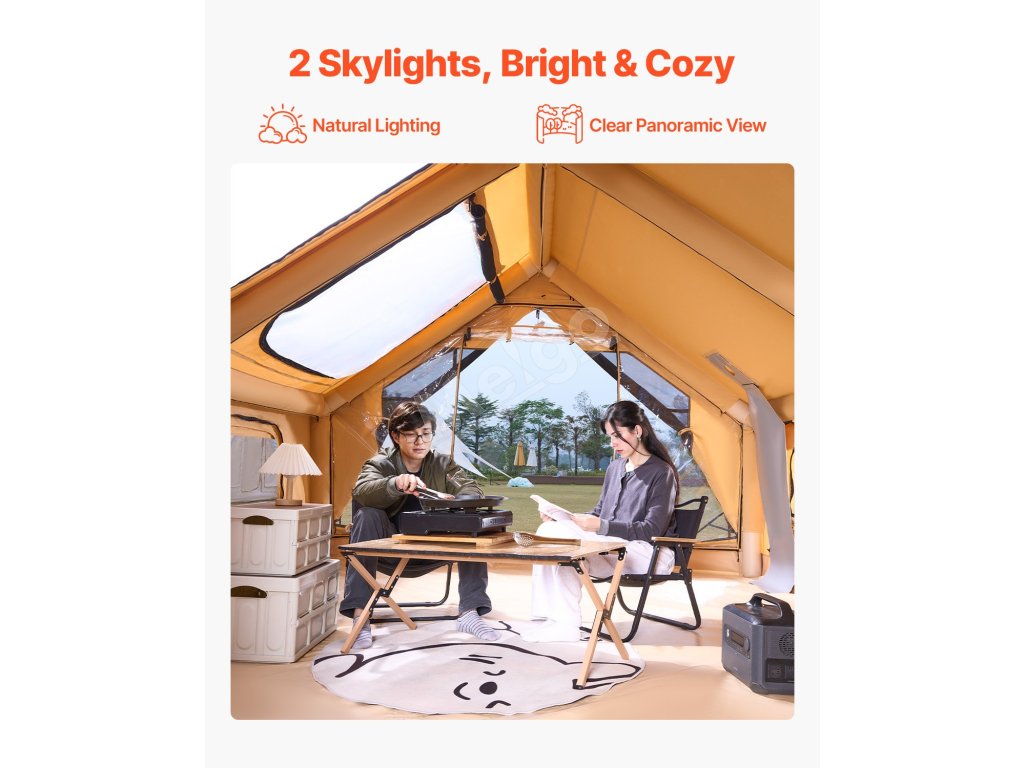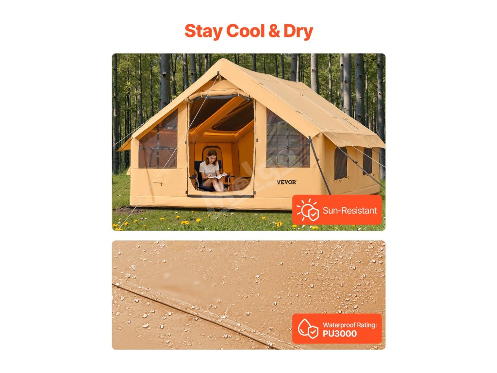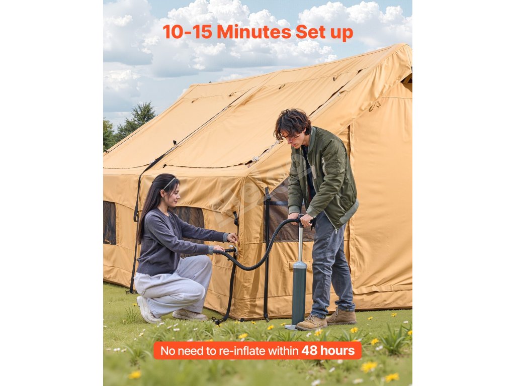 Tento nafukovací kempingový stan poskytuje 129 m² priestoru, čo je ideálne pre rodinu alebo skupinu priateľov. Či už rozkladáte kreslá a nafukovacie matrace, alebo si užívate spoločné chvíle, tento stan vytvára súkromné, prírodou naplnené útočisko pre vaše kempingové dobrodružstvá.