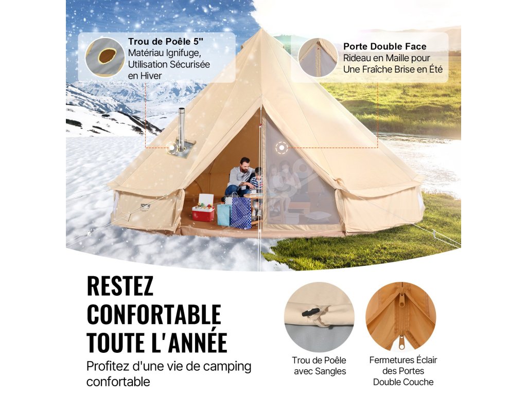 Zažite bezkonkurenčný komfort pri kempovaní! Tento plátenný stan je vybavený konektorom na kachle, ktorý vám umožní zostať v teple počas chladných zimných nocí. Má štyri okná a sieťované dvere, vďaka ktorým môžete oceniť krásu nočnej oblohy. Môžete ho dokonca použiť ako baldachýn, aby ste sa dostali ešte bližšie k prírode.