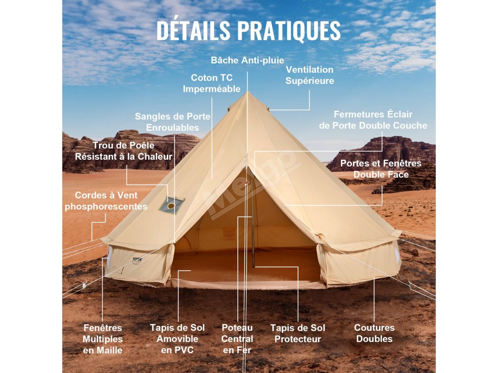 Ideálny na dobrodružstvá v prírode! Náš zvonový stan je vyrobený z priedušného bavlneného plátna TC (zmes 65 % polyesteru a 35 % bavlny), ktoré je ideálne do mierneho až stredne silného dažďa. V prípade silného dažďa alebo búrky pridajte dodatočný nepremokavý obal. Podložka na zemi ponúka odolnosť proti snehu a vetru pre pohodlie a sucho.