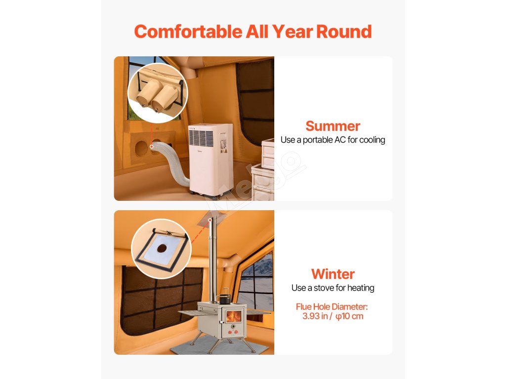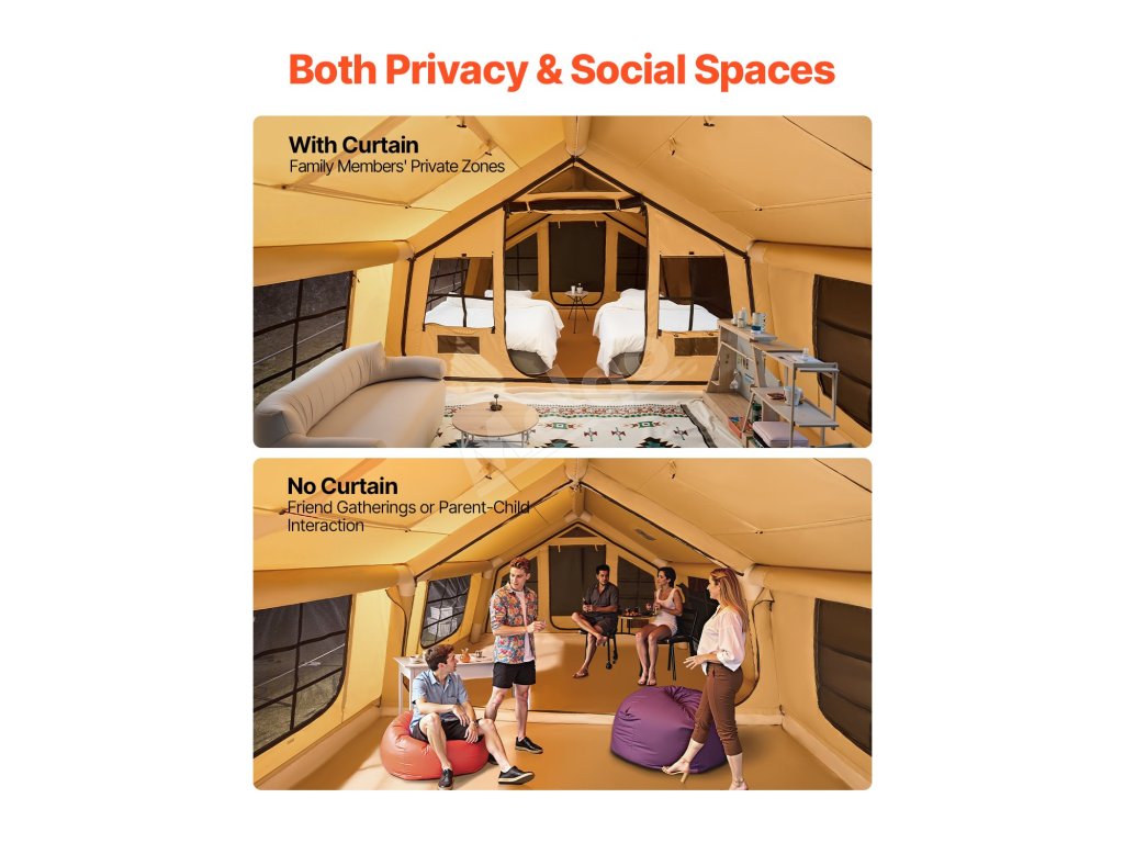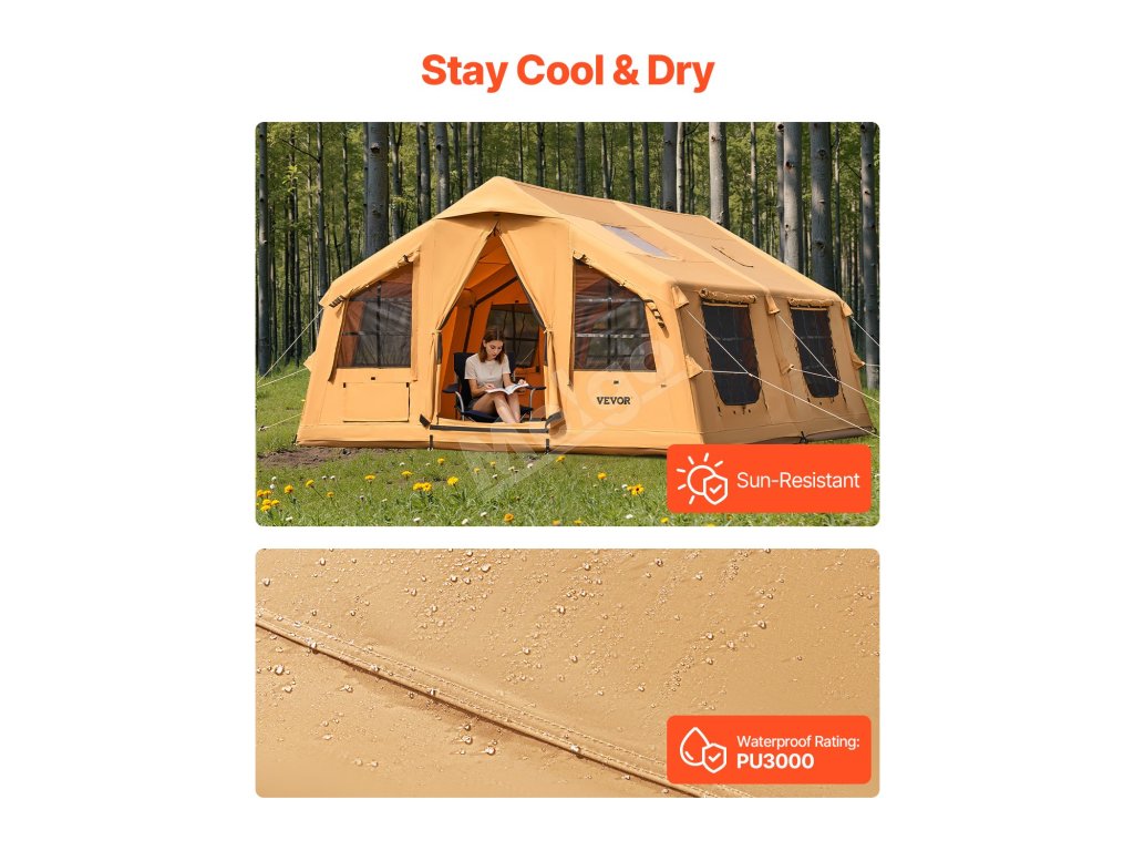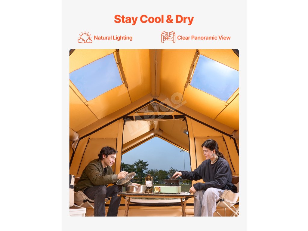 Tento nafukovací stan s vonkajším priestorom 186 m² je ideálny na rodinné alebo skupinové kempovanie. Či už umiestňujete stoličky, nafukovacie matrace alebo si jednoducho užívate čas s rodinou, tento stan vytvára súkromný priestor v prírode.