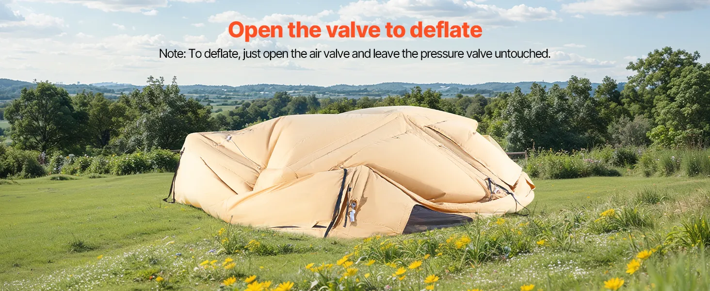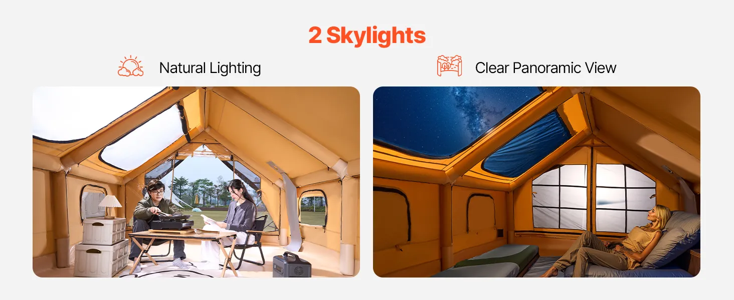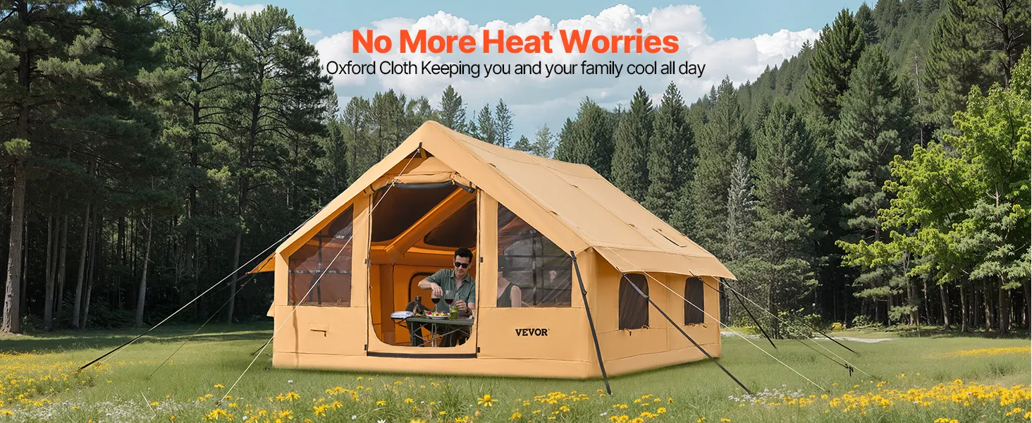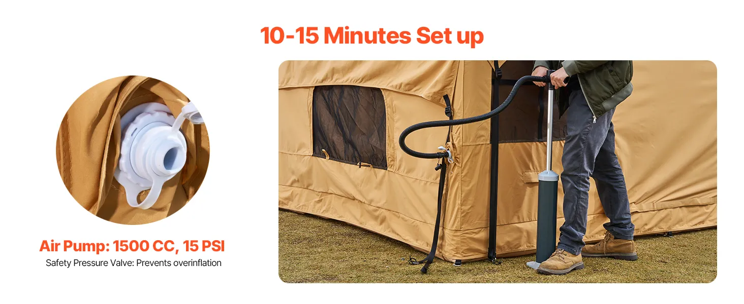 Tento nafukovací kempingový stan poskytuje 129 m² priestoru, čo je ideálne pre rodinu alebo skupinu priateľov. Či už rozkladáte kreslá a nafukovacie matrace, alebo si užívate spoločné chvíle, tento stan vytvára súkromné, prírodou naplnené útočisko pre vaše kempingové dobrodružstvá.