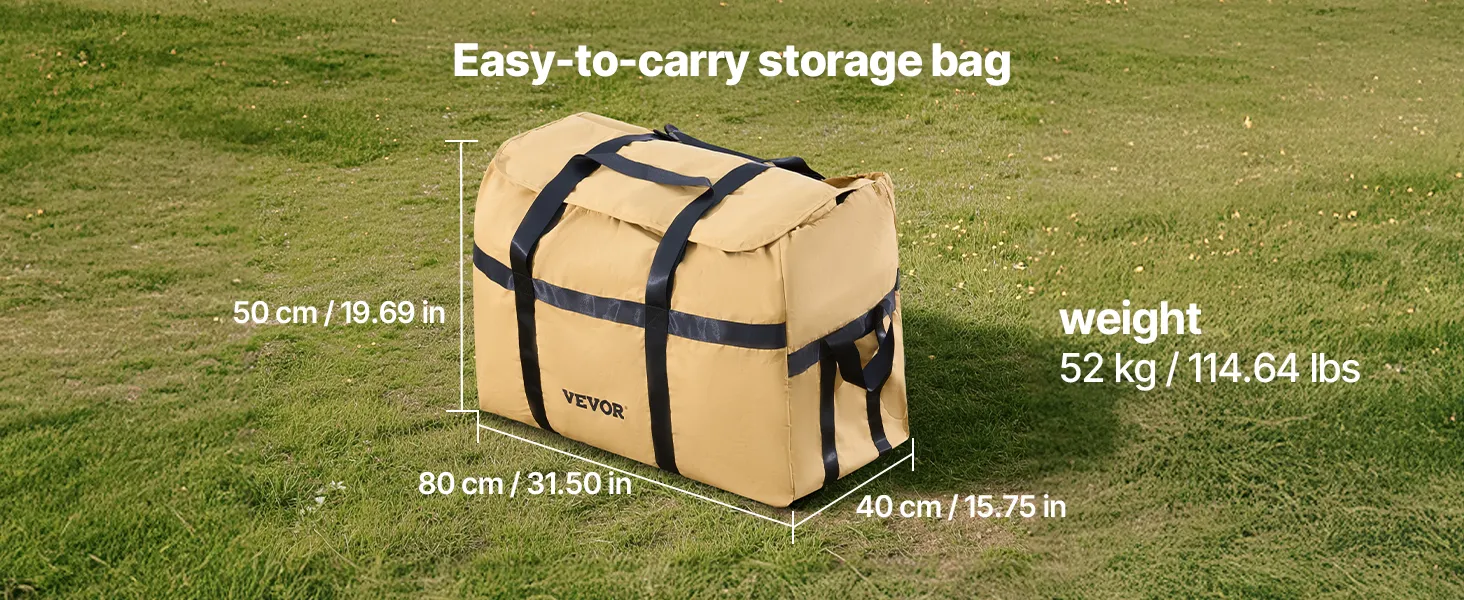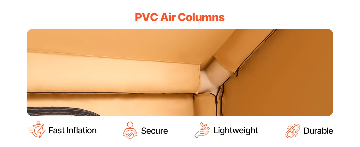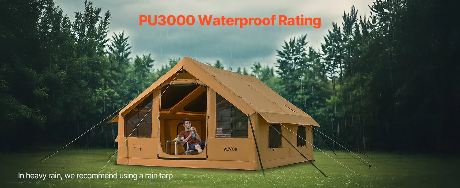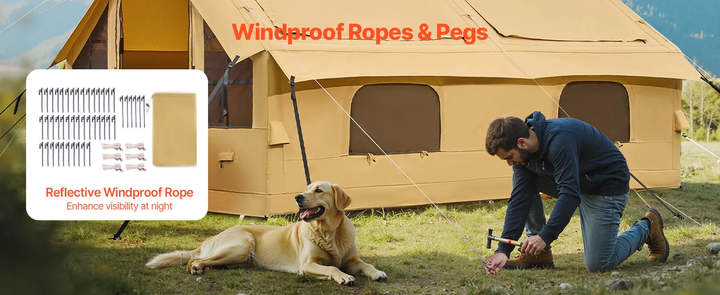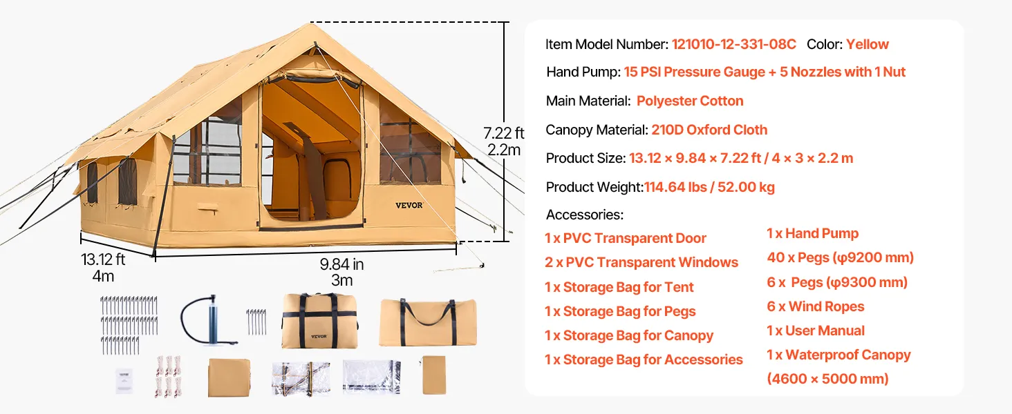 Tento nafukovací kempingový stan poskytuje 129 m² priestoru, čo je ideálne pre rodinu alebo skupinu priateľov. Či už rozkladáte kreslá a nafukovacie matrace, alebo si užívate spoločné chvíle, tento stan vytvára súkromné, prírodou naplnené útočisko pre vaše kempingové dobrodružstvá.