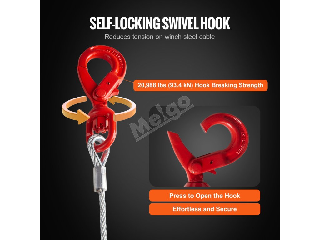 Keď zatiahnete za hák oceľového lana navijaka, automaticky sa zaistí na mieste. Vďaka 360-stupňovej rotačnej konštrukcii zvláda rotačné sily počas zdvíhania, čo uľahčuje jeho ovládanie.