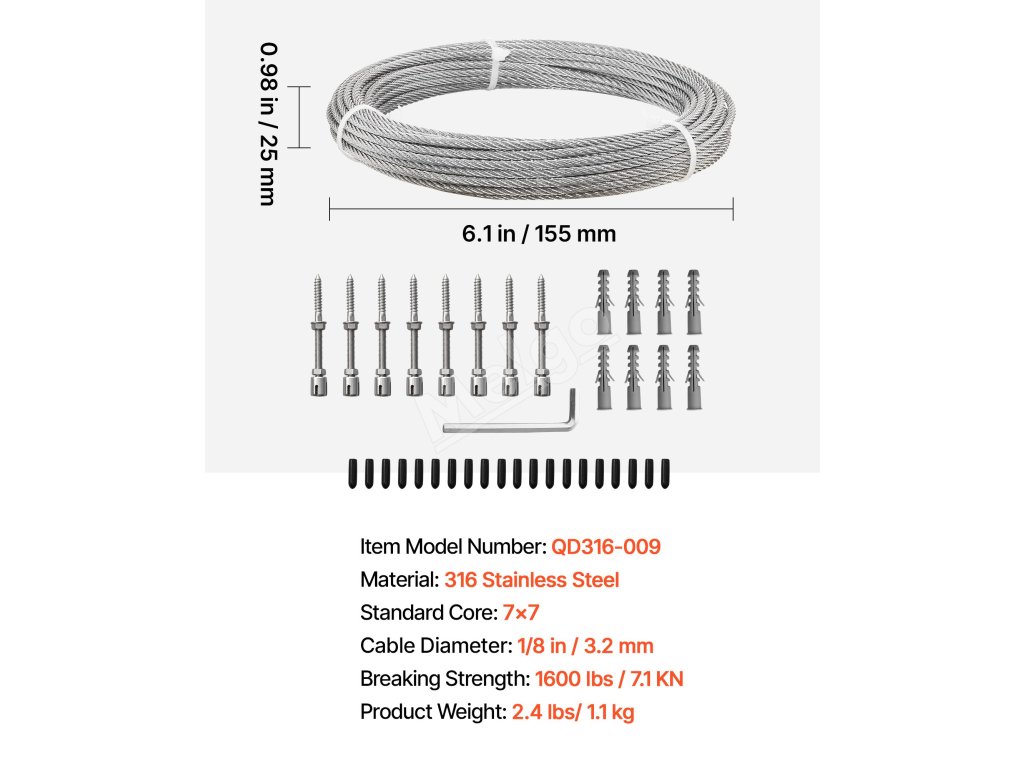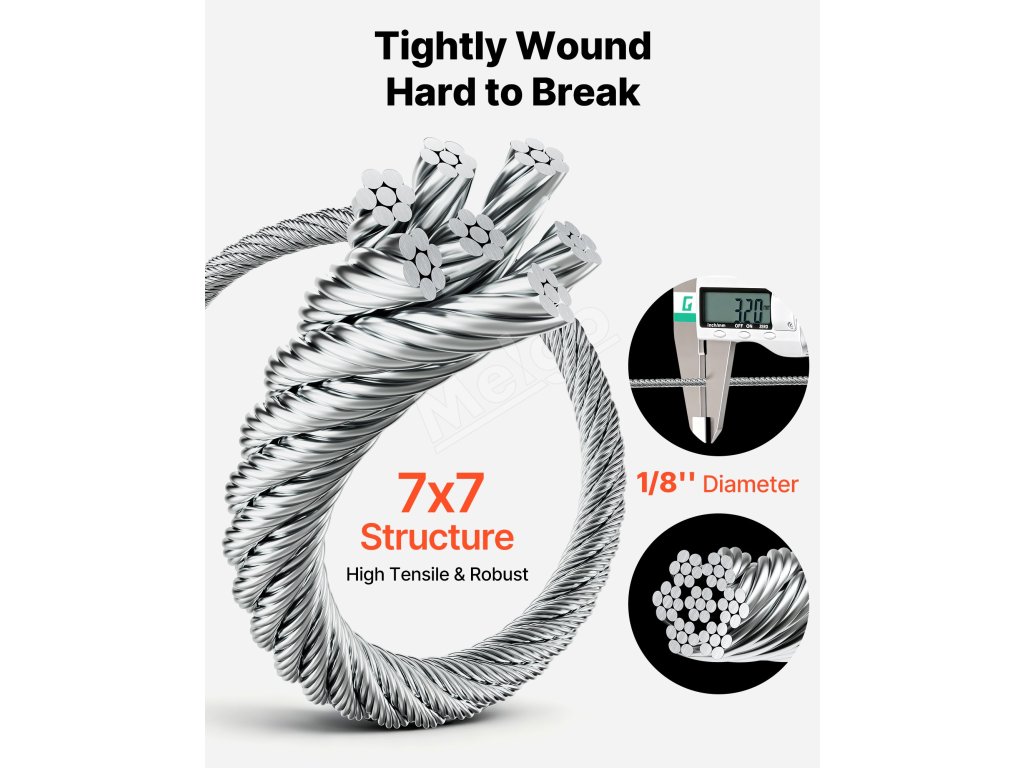 Tento drôt z nerezovej ocele 316 v námornej kvalite s rozmermi 7x7 spája vysokú pevnosť s odolnosťou proti korózii. Kábel s priemerom 1/8 palca má pevnosť v ťahu až 1 600 lb, čo je ideálne pre zábradlia, ploty, mreže a svietidlá.